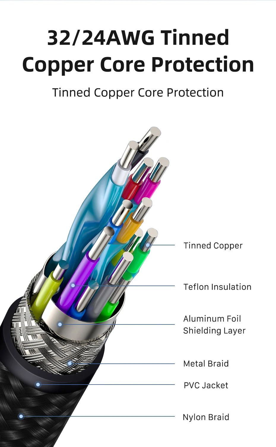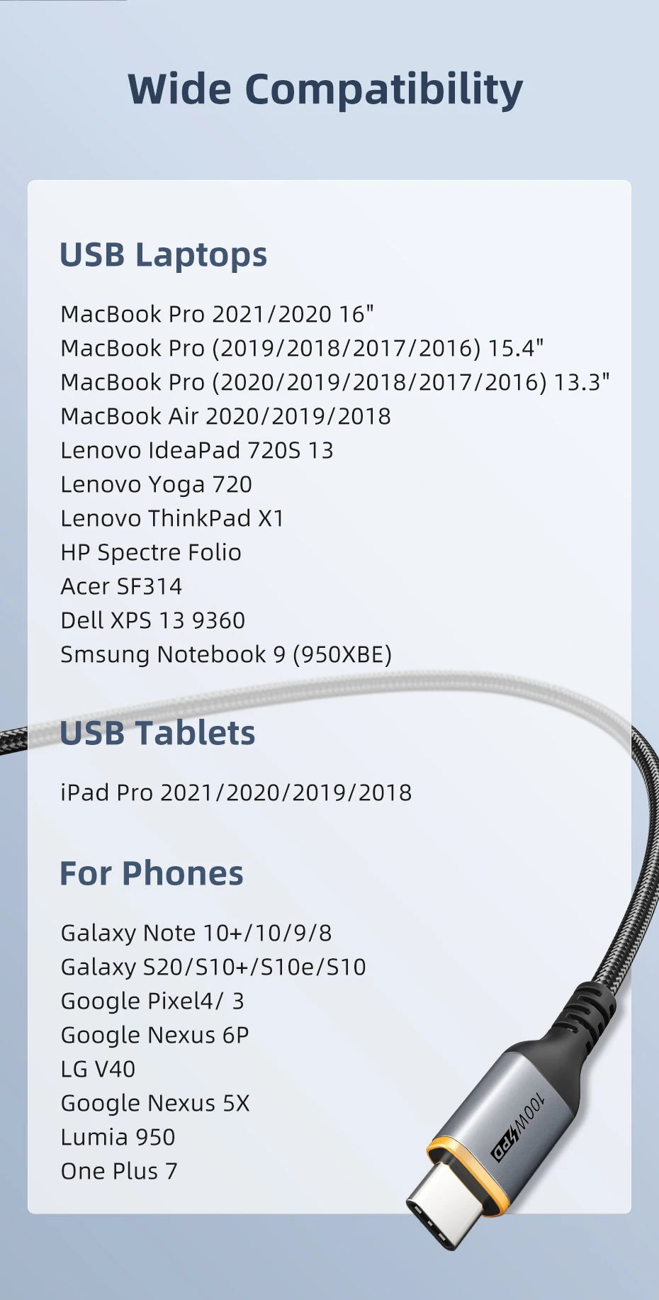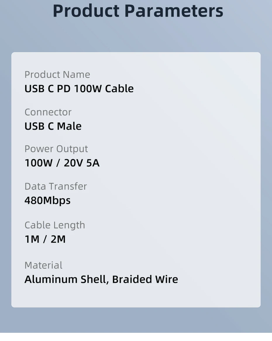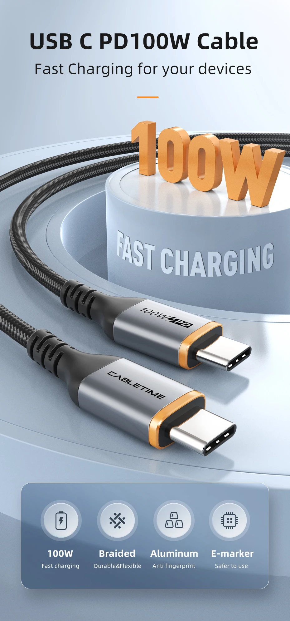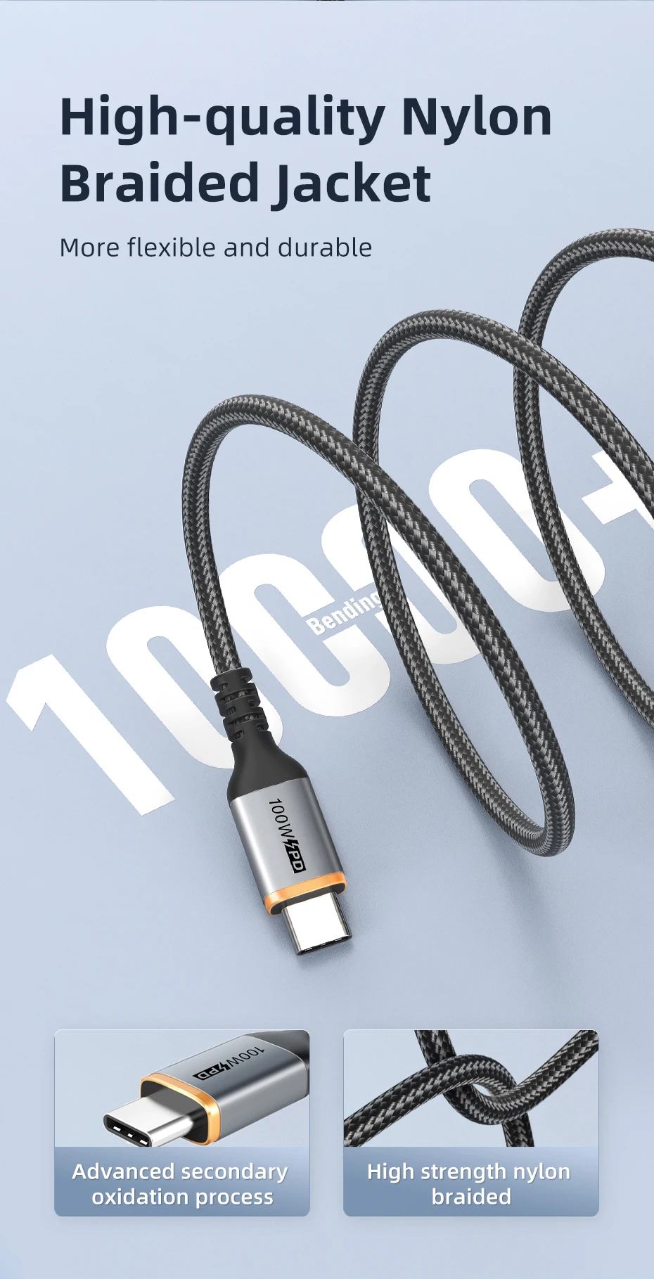 El cable de carga USB C está hecho de aleación de aluminio con una mejor disipación del calor. La chaqueta trenzada es duradera a través de más de 10.000 veces de prueba de flexión.