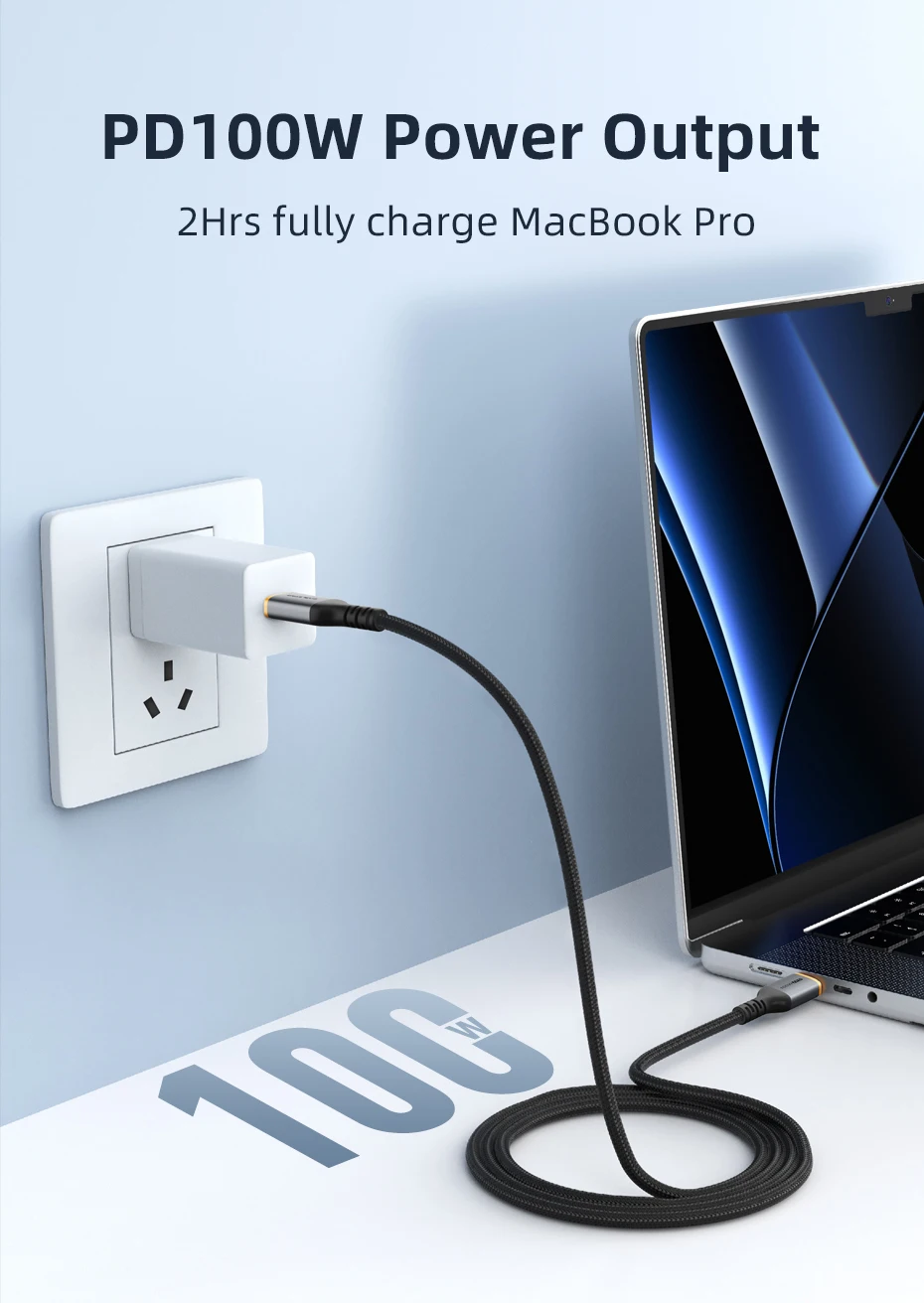 El cable de carga de hasta 100W admite una potencia de salida de hasta el tipo de cable de carga de la red de la USB-C. Combínelo con un cargador de 100W Para cargar rápidamente completamente su Macbook Pro en 2 horas. Cuenta con un conector de carga reversible para conectar simplemente un dispositivo USB C.