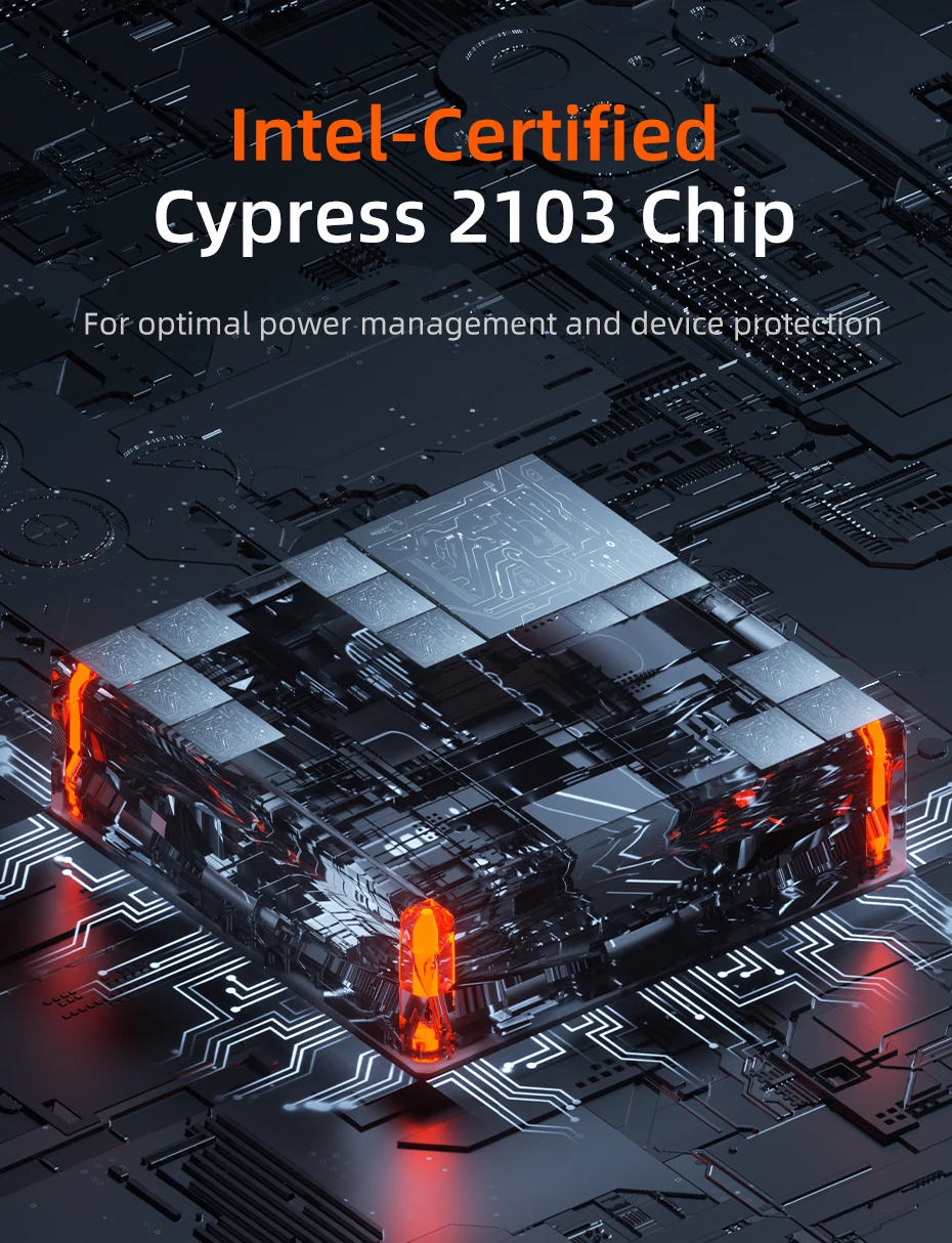 Chip Cypress 2103 certificado por el integrado y chip E-Marker para una carga confiable y segura. La protección múltiple, incluida la protección contra cortocircuitos y sobrecalentamiento, garantiza un proceso de carga estable y seguro para sus dispositivos. Te da tranquilidad mientras los usas.