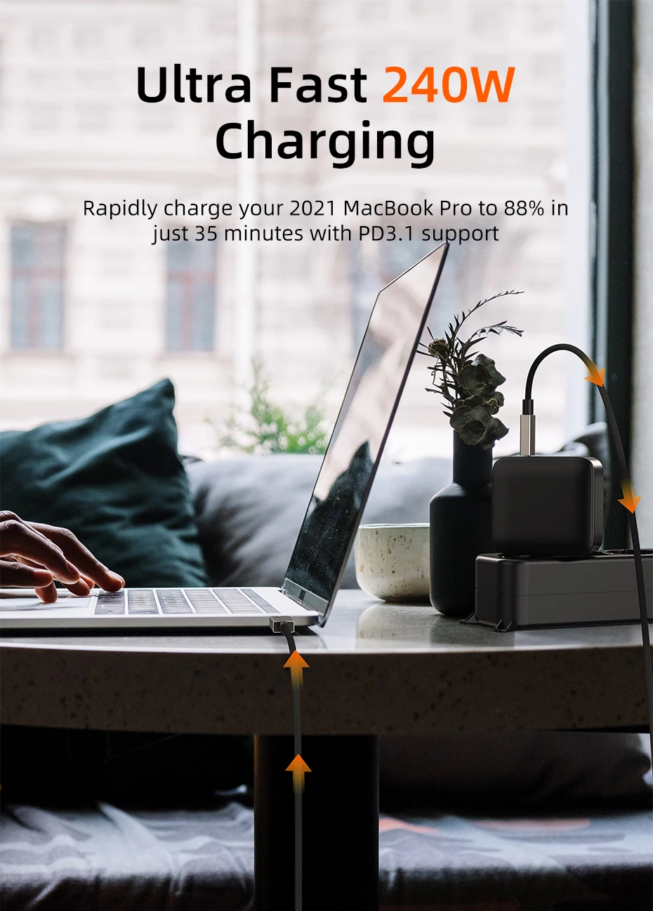 Carga más rápido que nunca con la potencia de 240W de este cable USB 4, con tecnología PD 3,1. Es compatible con versiones anteriores con adaptadores de menor potencia, como el de 140W de Apple. Carga rápidamente tu MacBook Pro 2021 a 88% en solo 35 minutos, manteniéndote encendido y listo para usar.