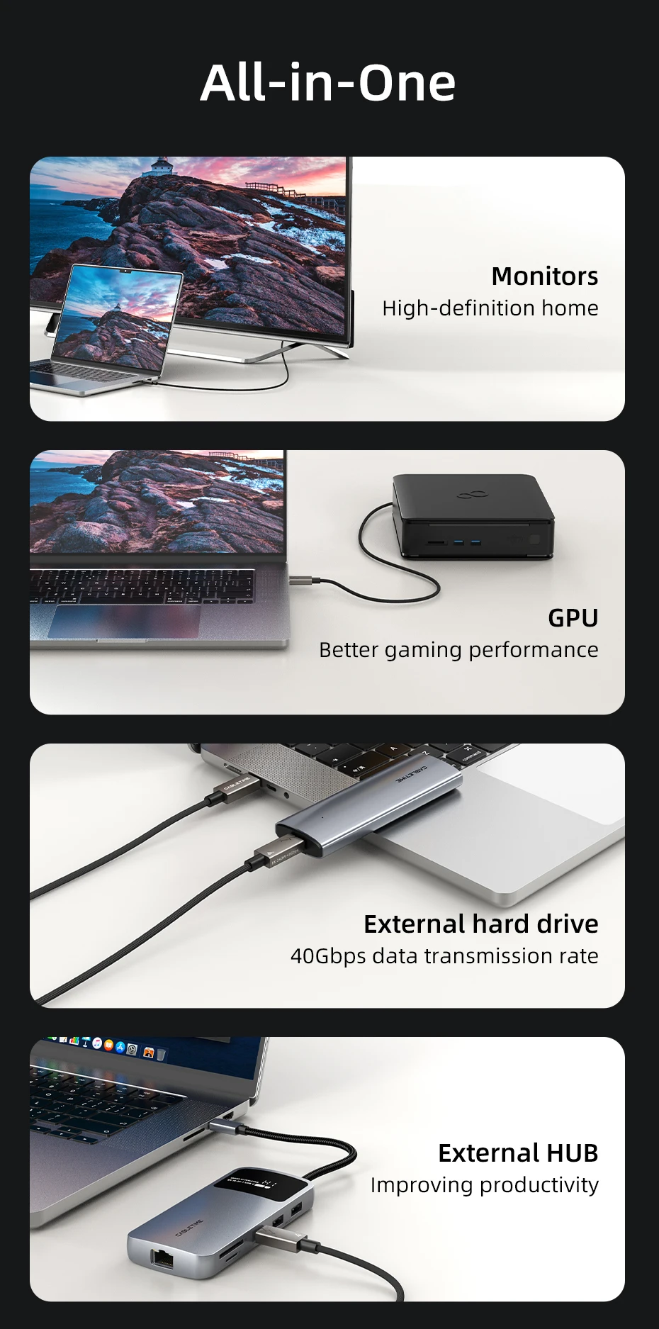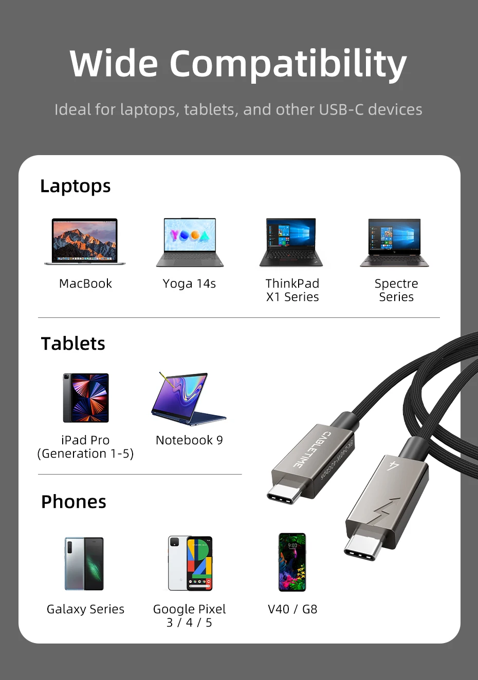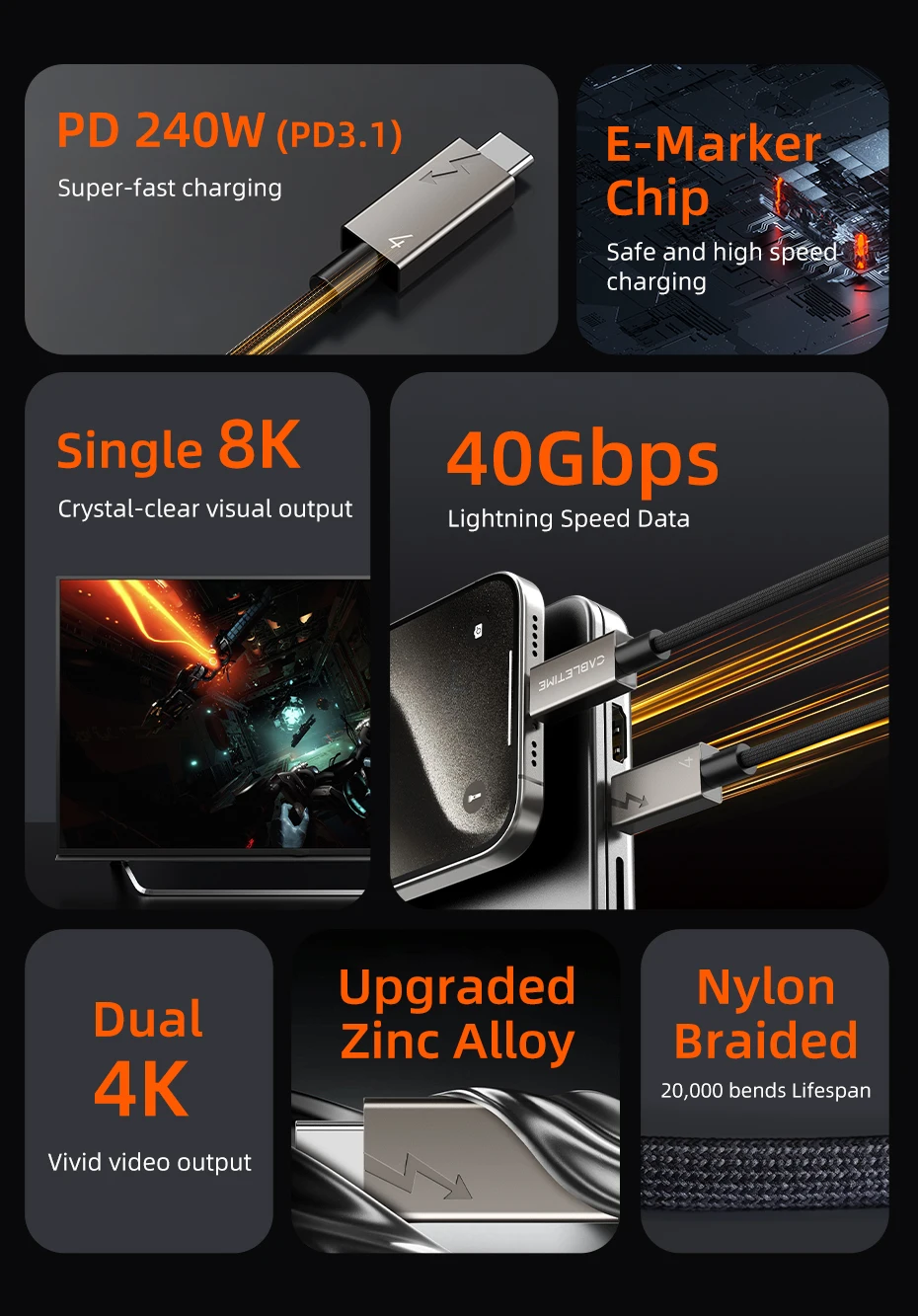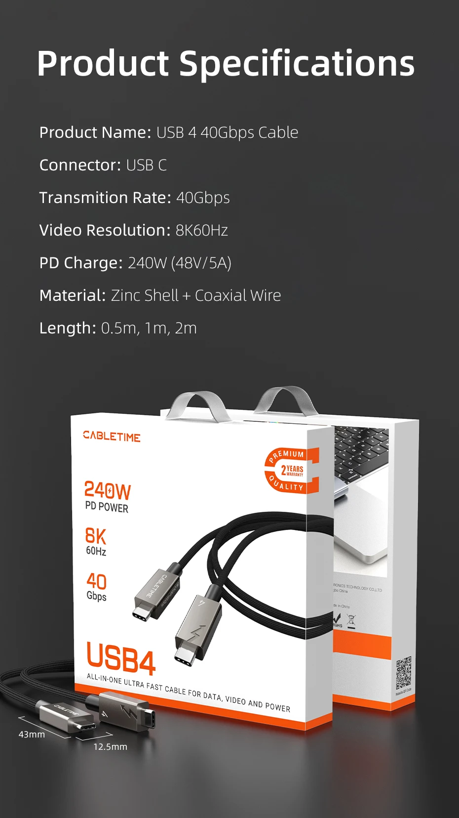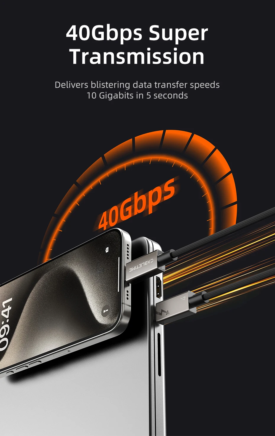 Cabletime USB 4 Cuenta con una asombrosa velocidad de 40Gbps. Esto es más de 8 veces más rápido que el USB 3,0, lo que le permite transferir música, películas o archivos en segundos. Disfrute de una eficiencia sin igual y ahorre un tiempo valioso con este cable de alta velocidad diseñado para mantenerse al día con su estilo de vida digital acelerado.