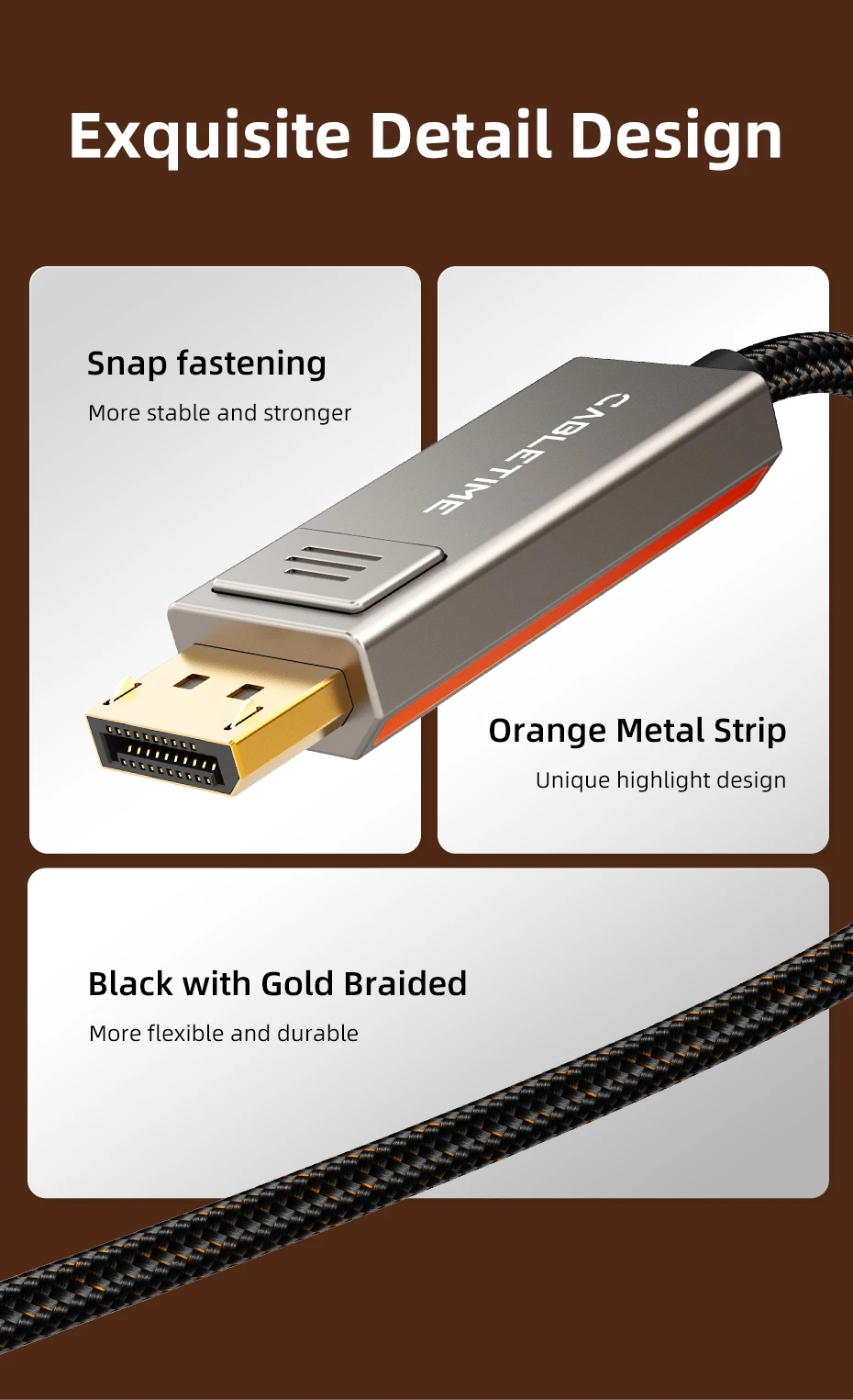 El Cable de conexión a DP cuenta con un chip EJ899T integrado y un diseño de interfaz DP a presión para un rendimiento estable y constante. Hecho con aleación de zinc y una chaqueta trenzada negra y dorada flexible y duradera para mayor durabilidad. ¡El exclusivo resaltado de rayas de metal naranja lo convierte en una adición llamativa a su Conjunto Tecnológico!