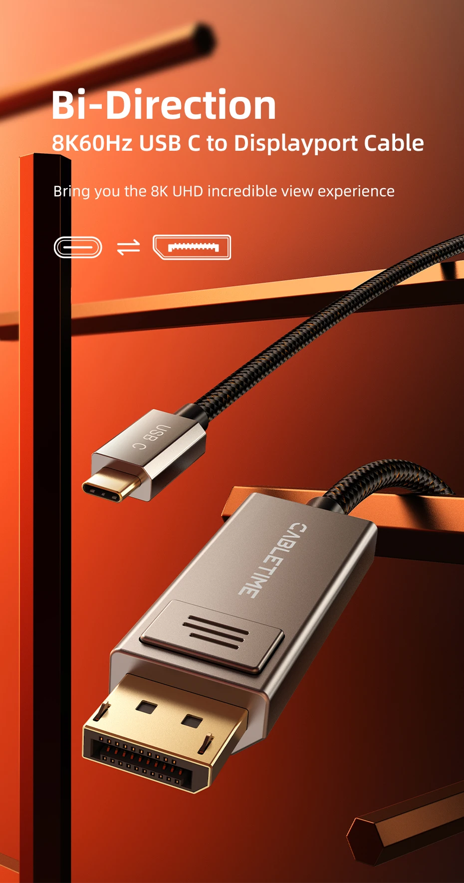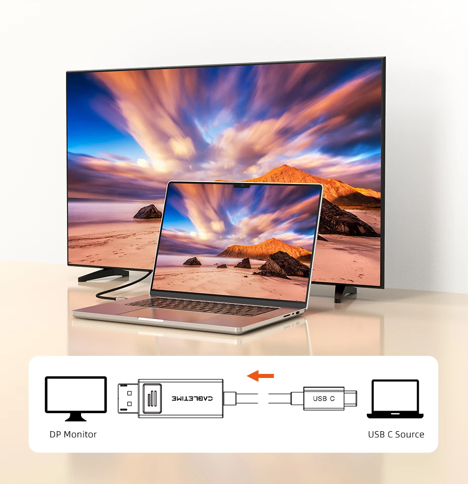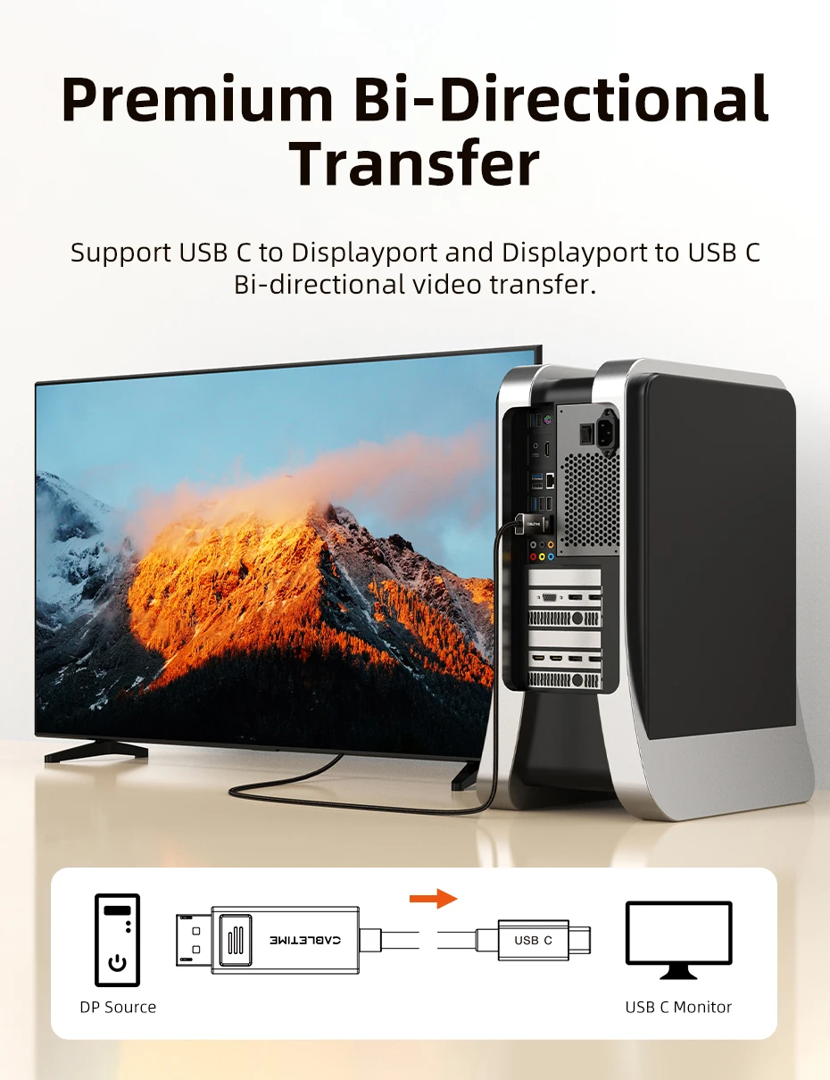 El cable Bidireccional USB tipo C a DisplayPort CABLETIME le permite transferir sin esfuerzo desde una fuente USB C a monitores DisplayPort y viceversa, brindándole una flexibilidad incomparable.Esta característica le brinda el poder de ampliar su espacio de trabajo o configuración de juegos para satisfacer sus necesidades dinámicas, ¡lo que hace que el multitarea sea muy sencillo!