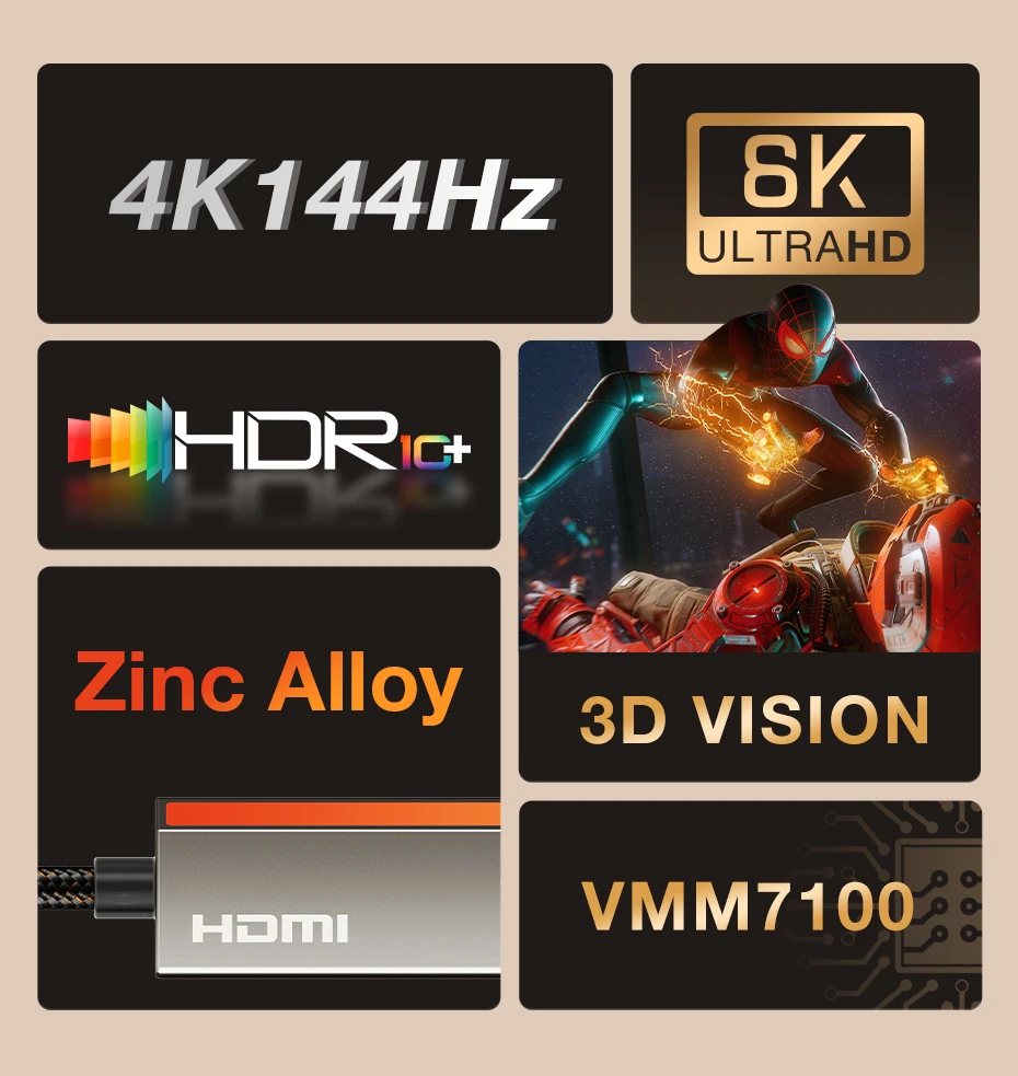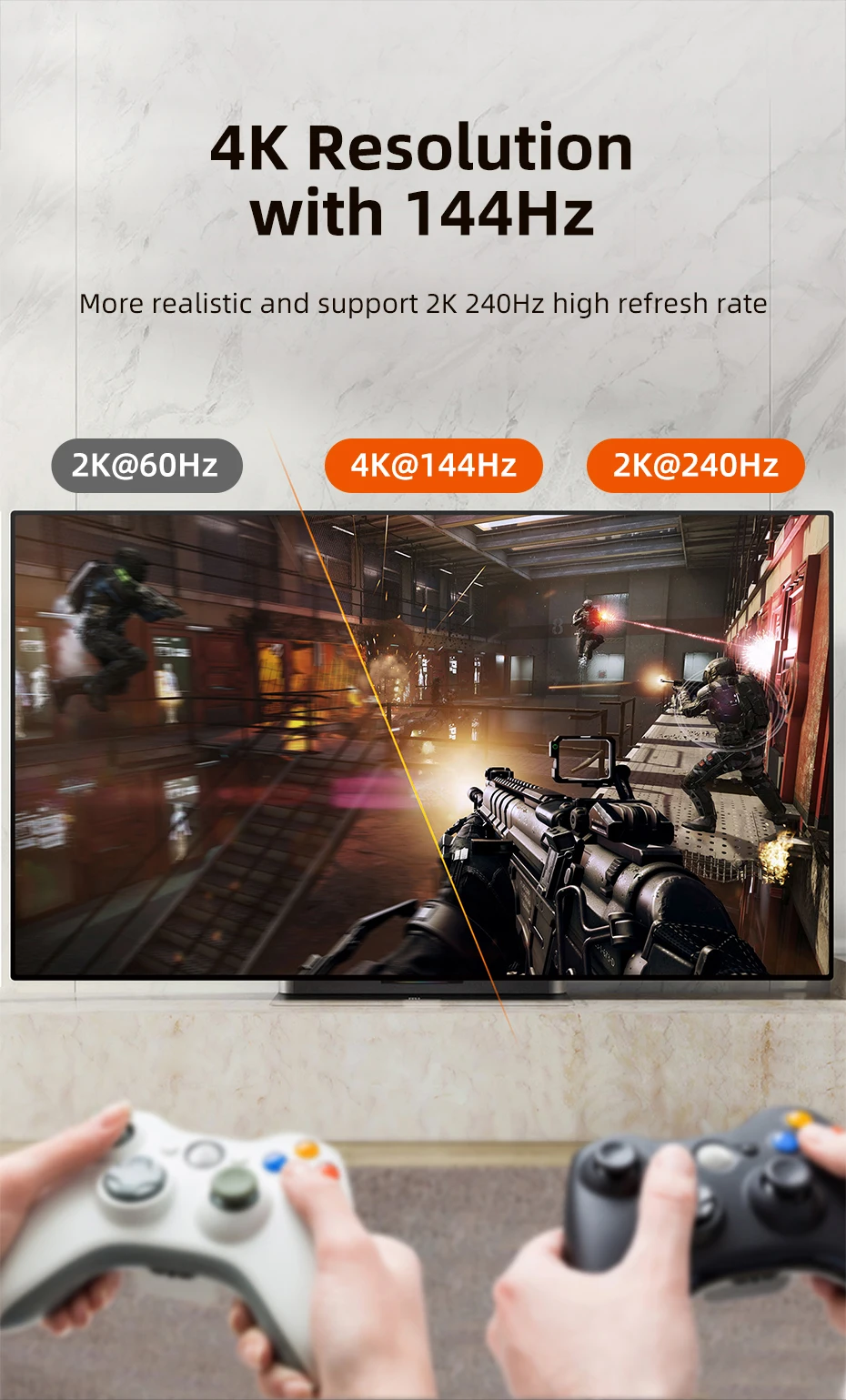 El cable funciona. Conectado a la TV - 4k 144Hz da una imagen clara, la imagen es fluida.