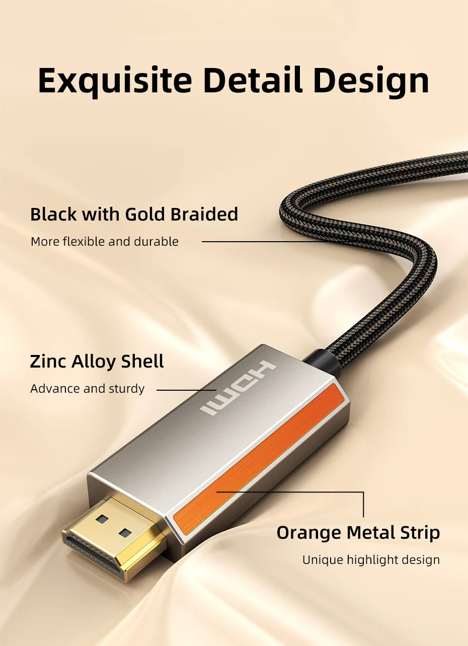 Chaqueta trenzada negra con raya naranja única: la chaqueta trenzada negra ofrece mayor resistencia y flexibilidad, mientras que la exclusiva franja naranja en la carcasa HDMI agrega un toque de estilo a su configuración.