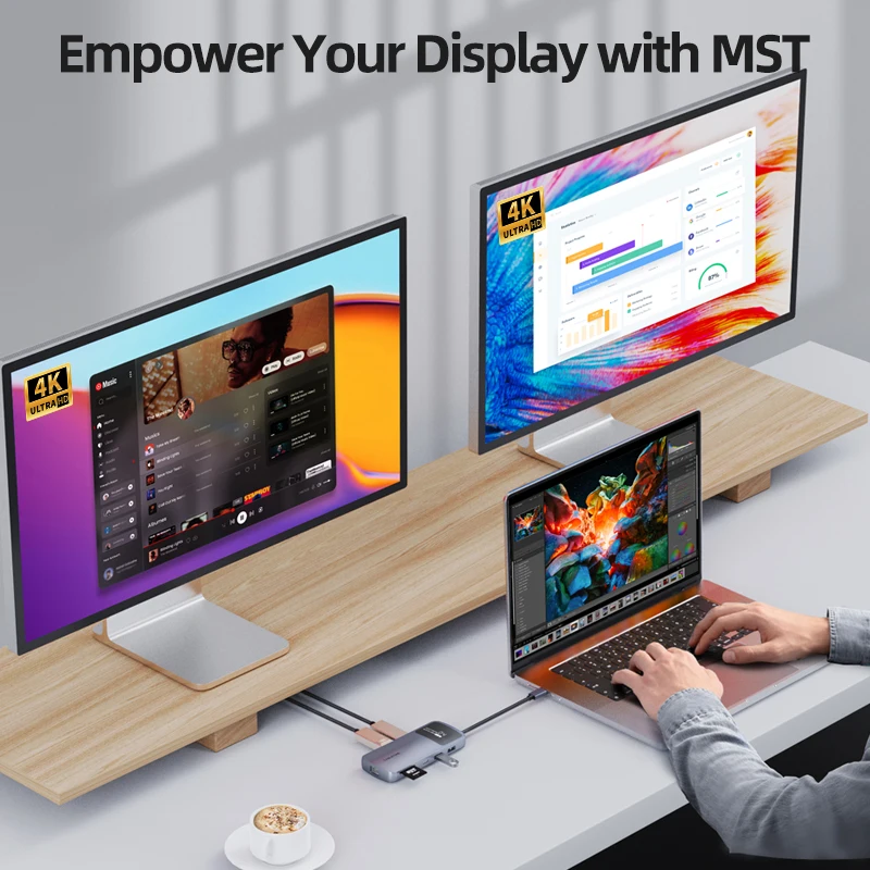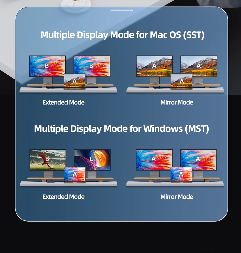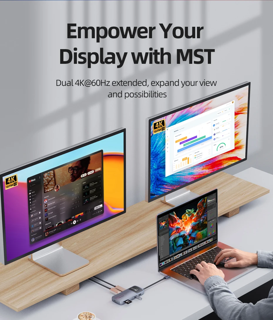 Este concentrador USB C es la solución perfecta para la pantalla multimonitor. Cuenta con 1 puerto HDMI y 1 puerto DP, ambos con función Windows MST, lo que le permite reflejar o ampliar la pantalla de su portátil a dos monitores adicionales, con una resolución de hasta 4K 60Hz.