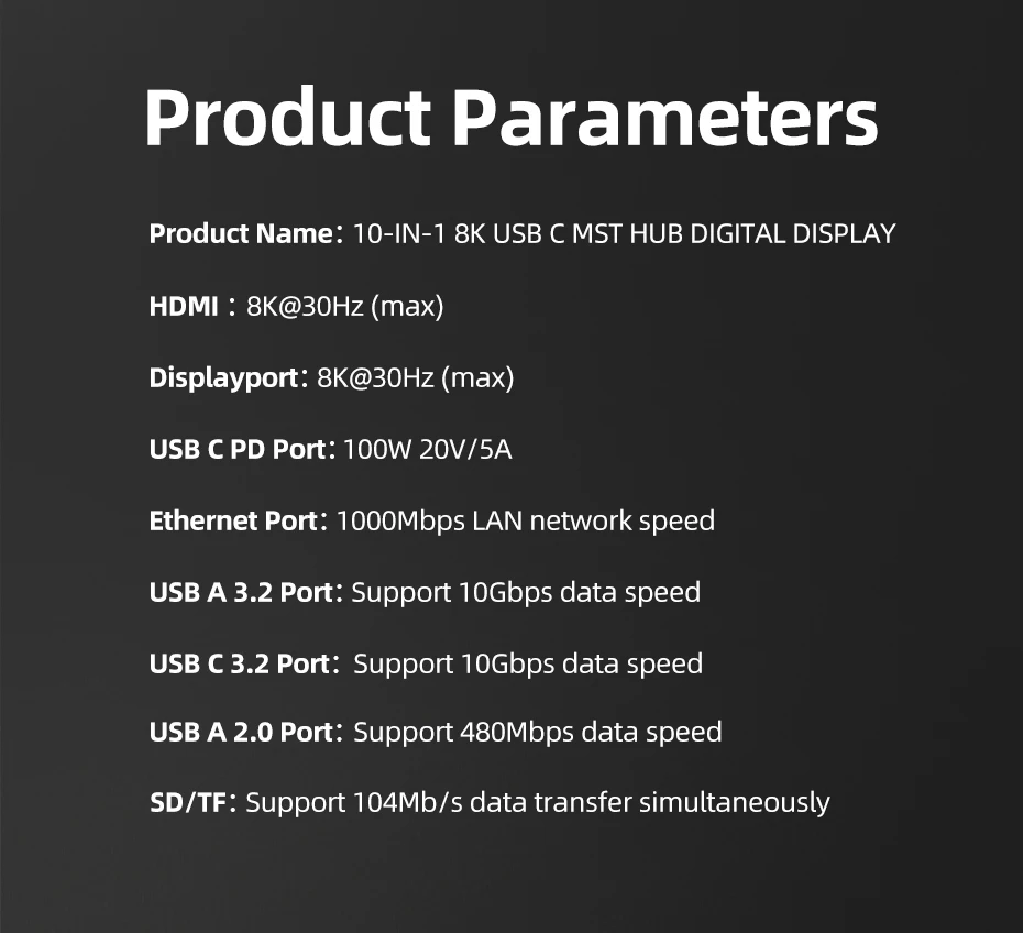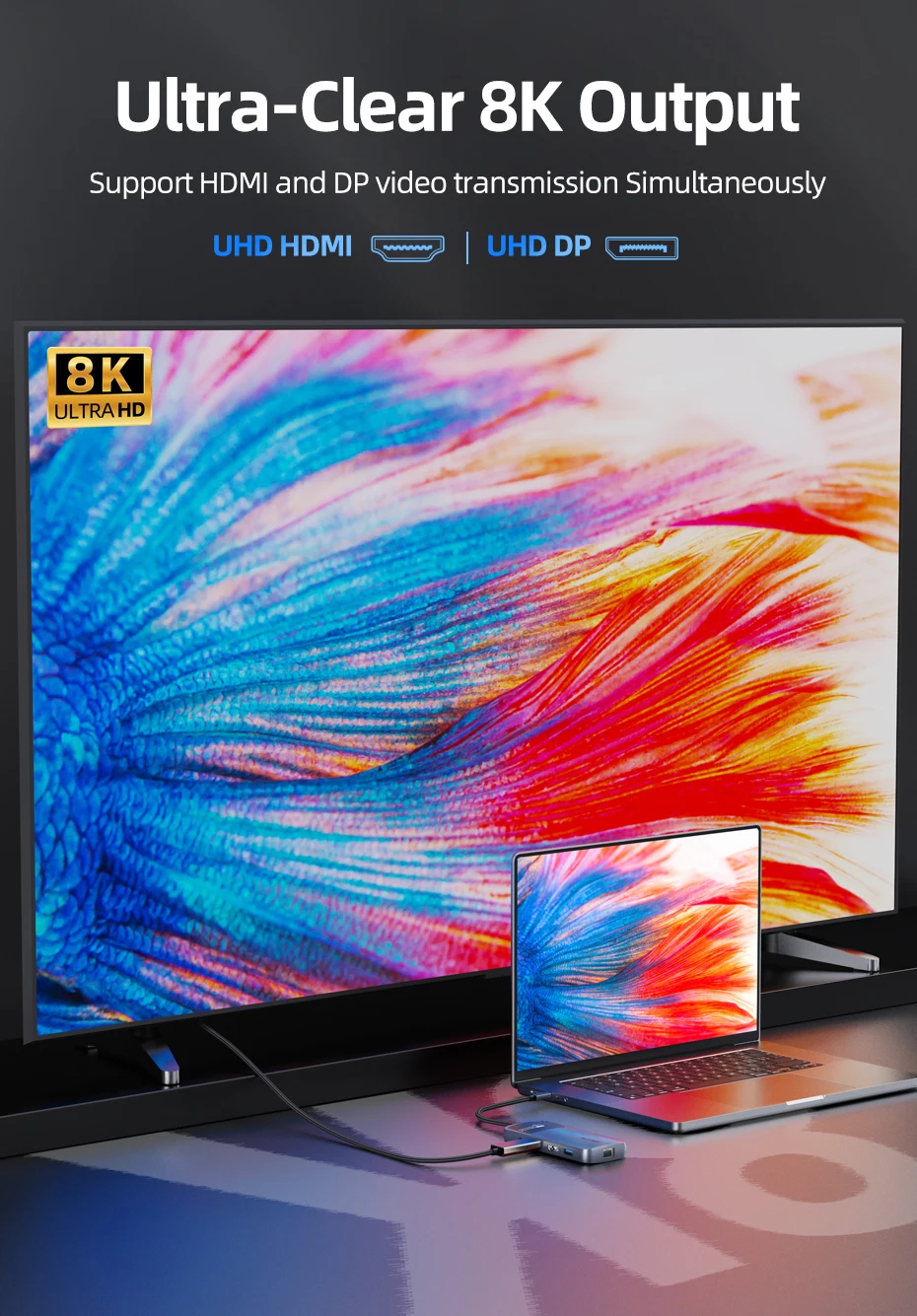 Amplíe las capacidades de su ordenador portátil con este concentrador de 8K30Hz de la red de 2 a 30Hz. Conecta un monitor HDMI o DP para obtener imágenes nítidas de 8K a 30Hz, o usa dos puertos para vídeo Ultra HD de hasta 4K a 60H. Tanto si está trabajando como jugando, disfrutará de un contenido cristalino sin retrasos.