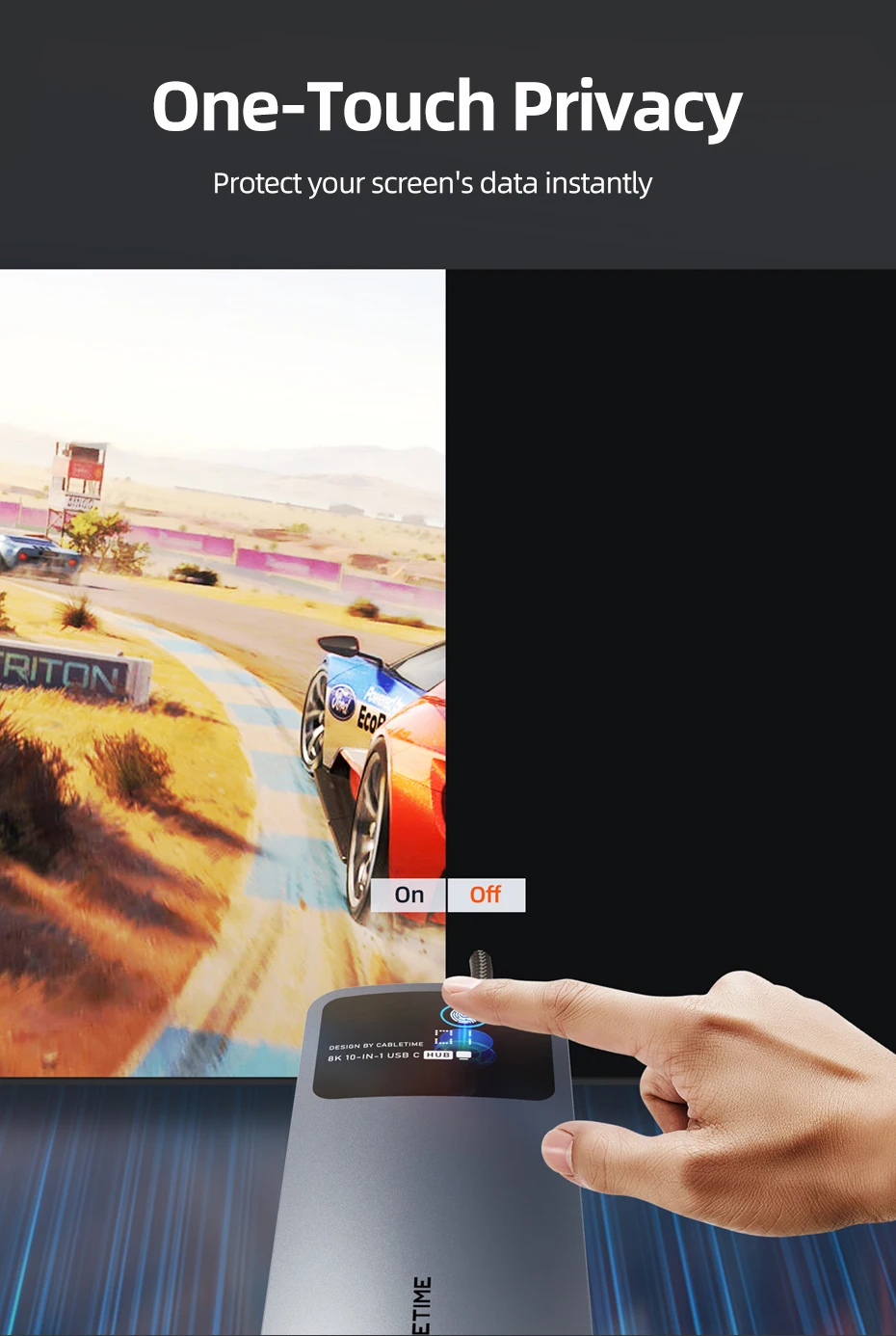Nuestro concentrador USB C 10 en 1 le brinda un entorno de trabajo seguro y privado. Con un simple toque, su pantalla está a salvo de espectadores no deseados, perfecta para espacios de trabajo compartidos o lugares públicos. Disfrute de la tranquilidad de saber que su información confidencial estará segura dondequiera que vaya.
