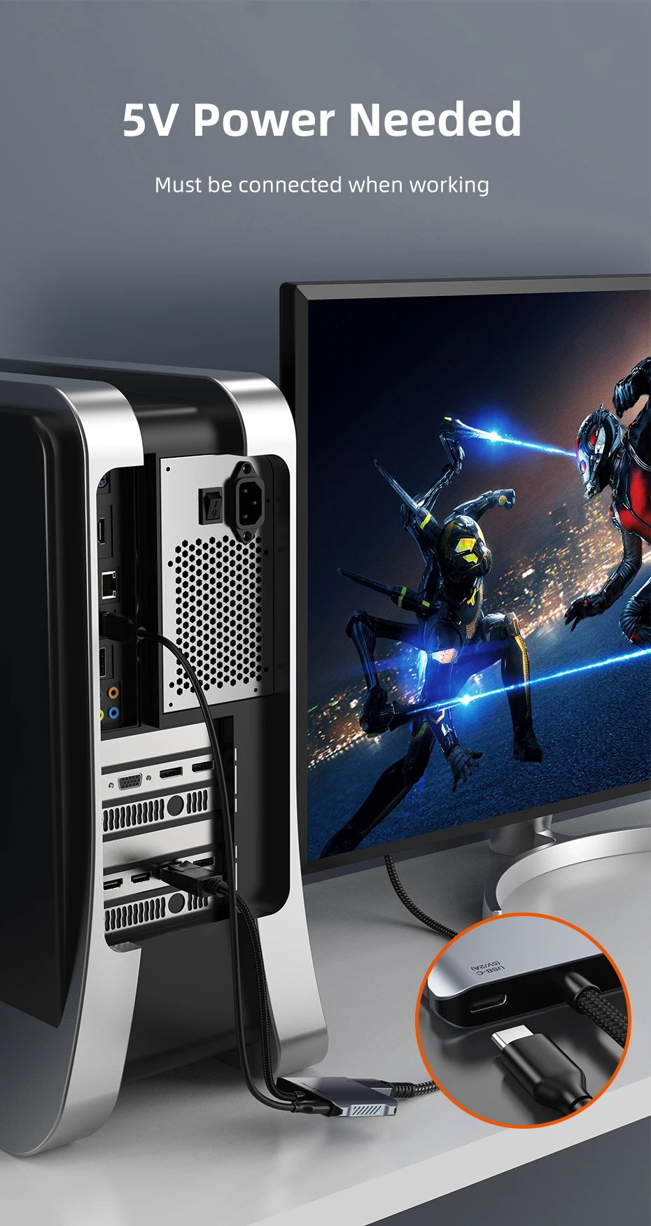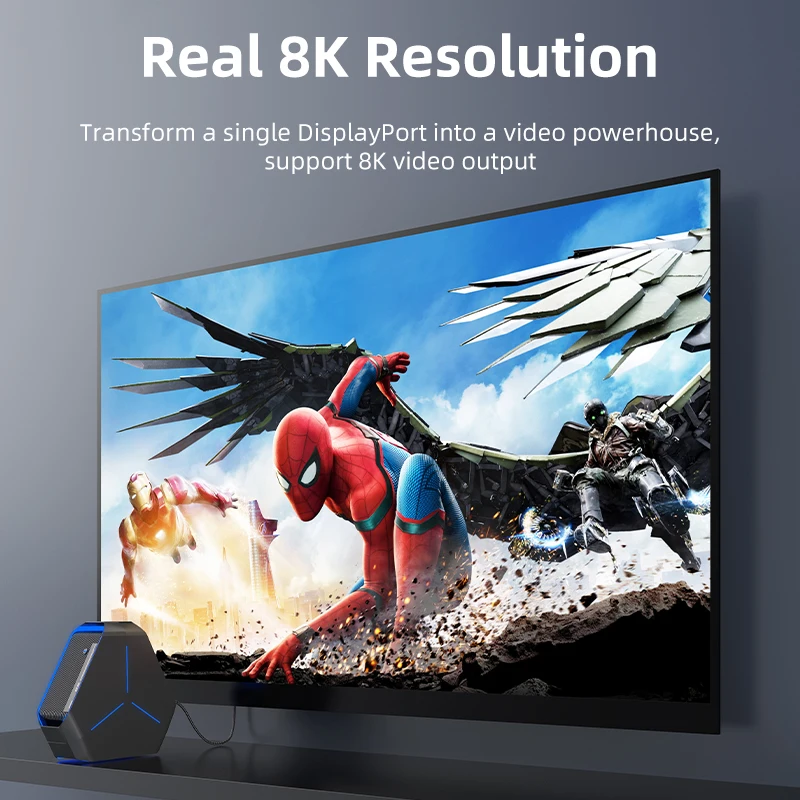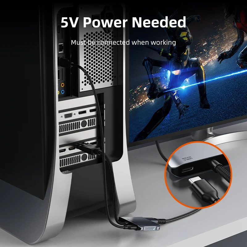 El adaptador multipuerto Displayport cuenta con una salida de vídeo HDMI 8K, una salida de vídeo HDMI 4K y un puerto USB C de 5V. El Puerto USB C está diseñado para suministrar la potencia requerida de 5V y debe conectarse cuando esté en funcionamiento.
