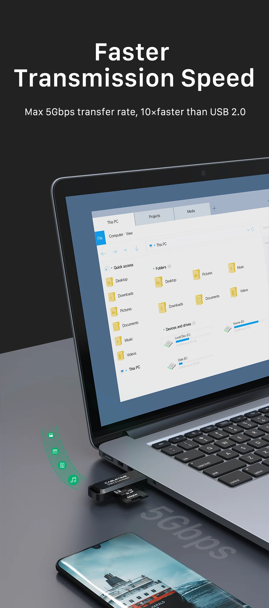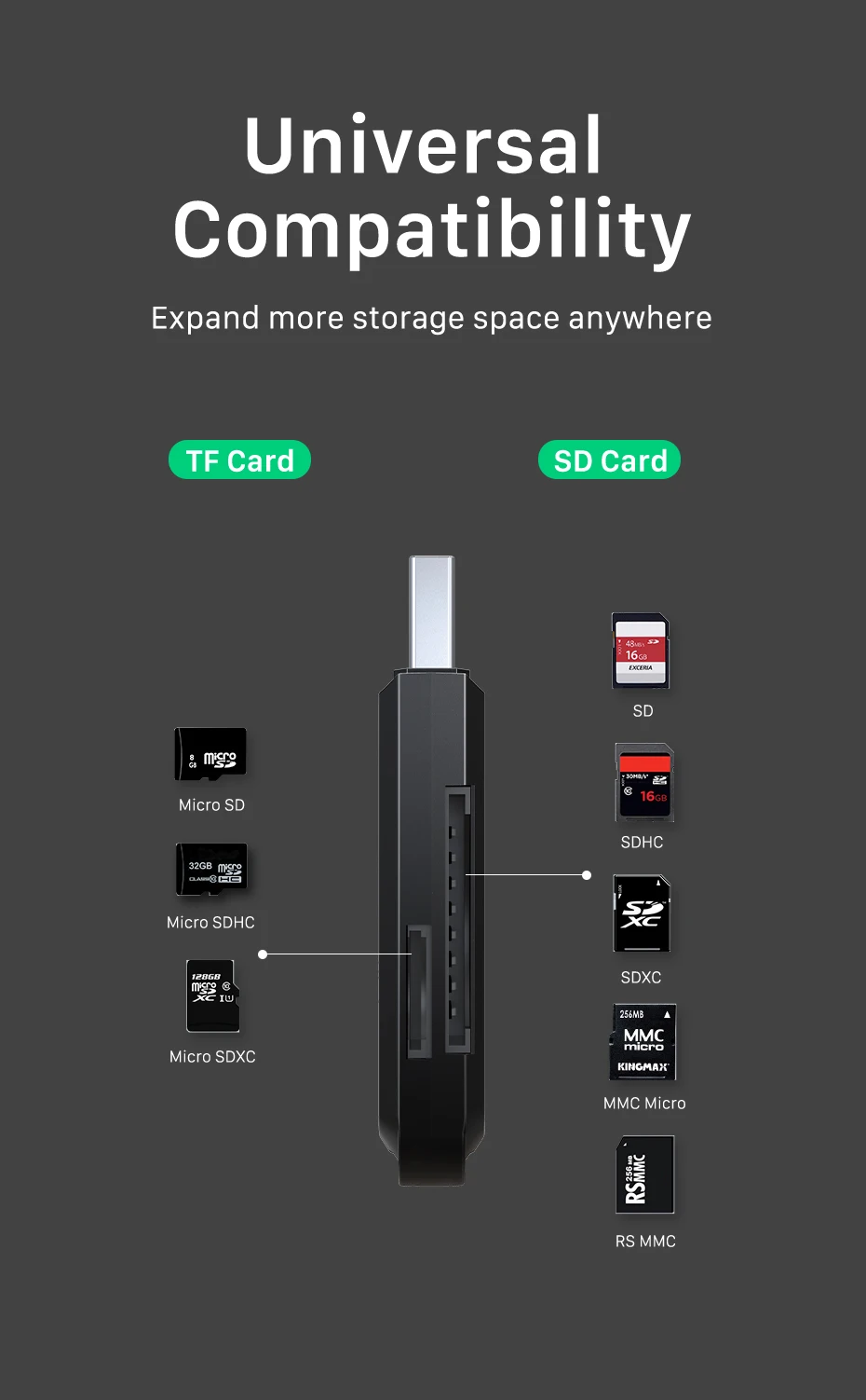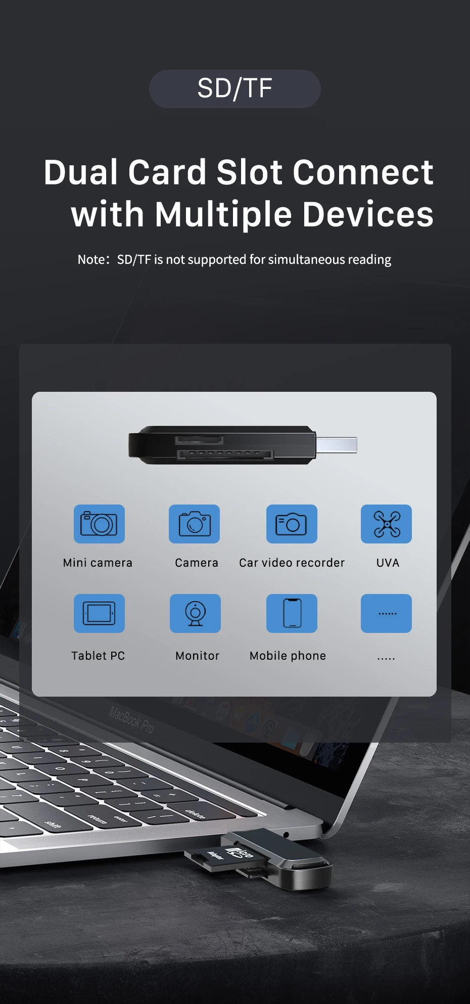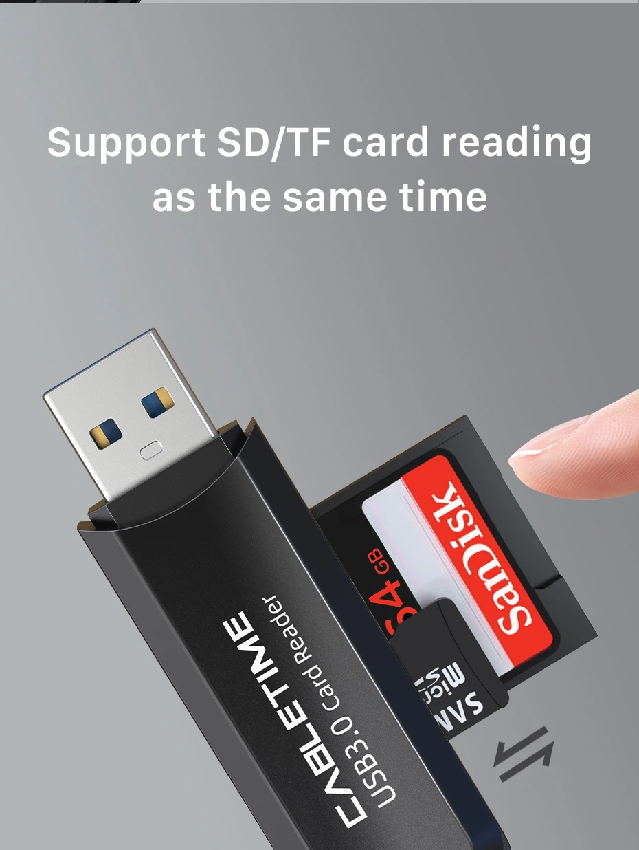 Lector de tarjetas 2 en 1: lee la tarjeta SD y la tarjeta TF al mismo tiempo a una velocidad de hasta 100 MB/s.