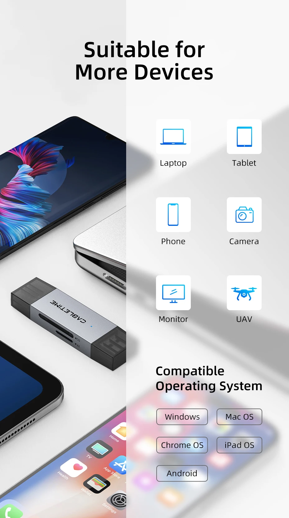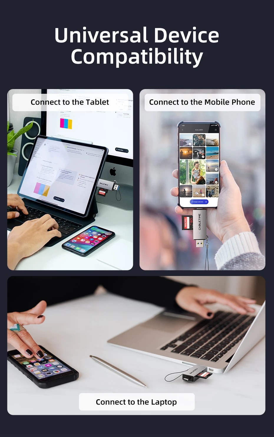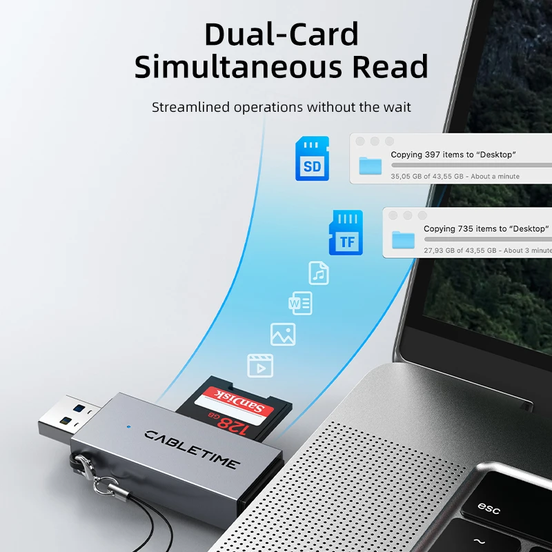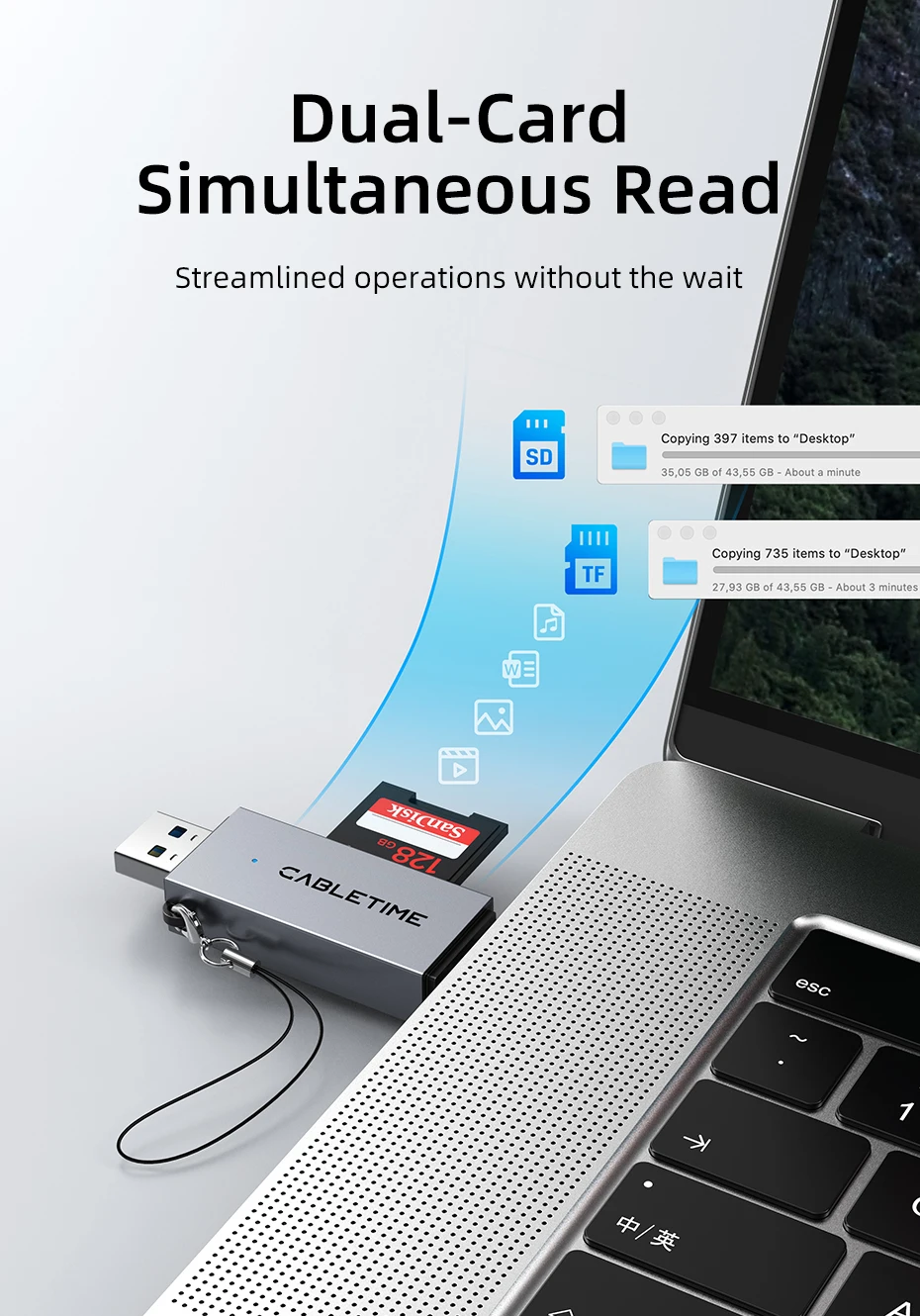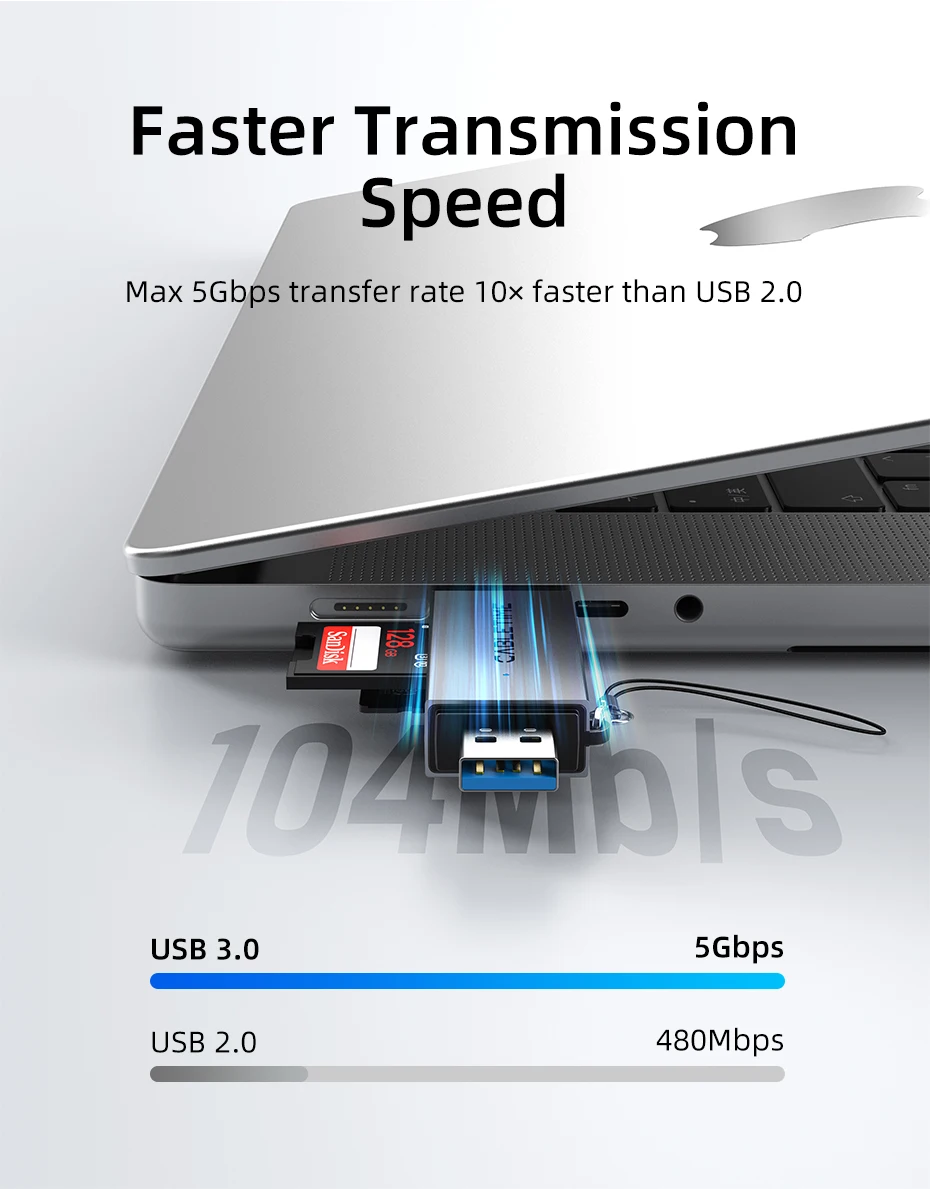 Mueve archivos entre tus tarjetas SD y dispositivos como MacBook Pro, teléfono Android y iPad a velocidades de hasta 104 MB/s. Nuestro adaptador de lector de tarjetas SD USB C, equipado con el avanzado chip GL3235, admite fácilmente hasta 2TB de datos. Está diseñado para un manejo de datos eficiente y de alta capacidad.