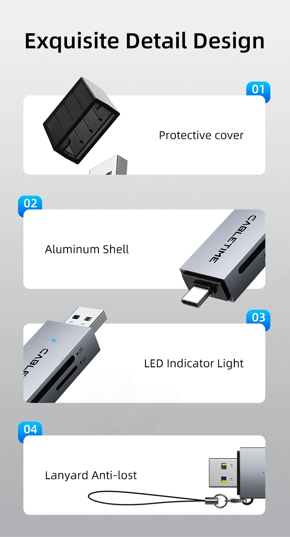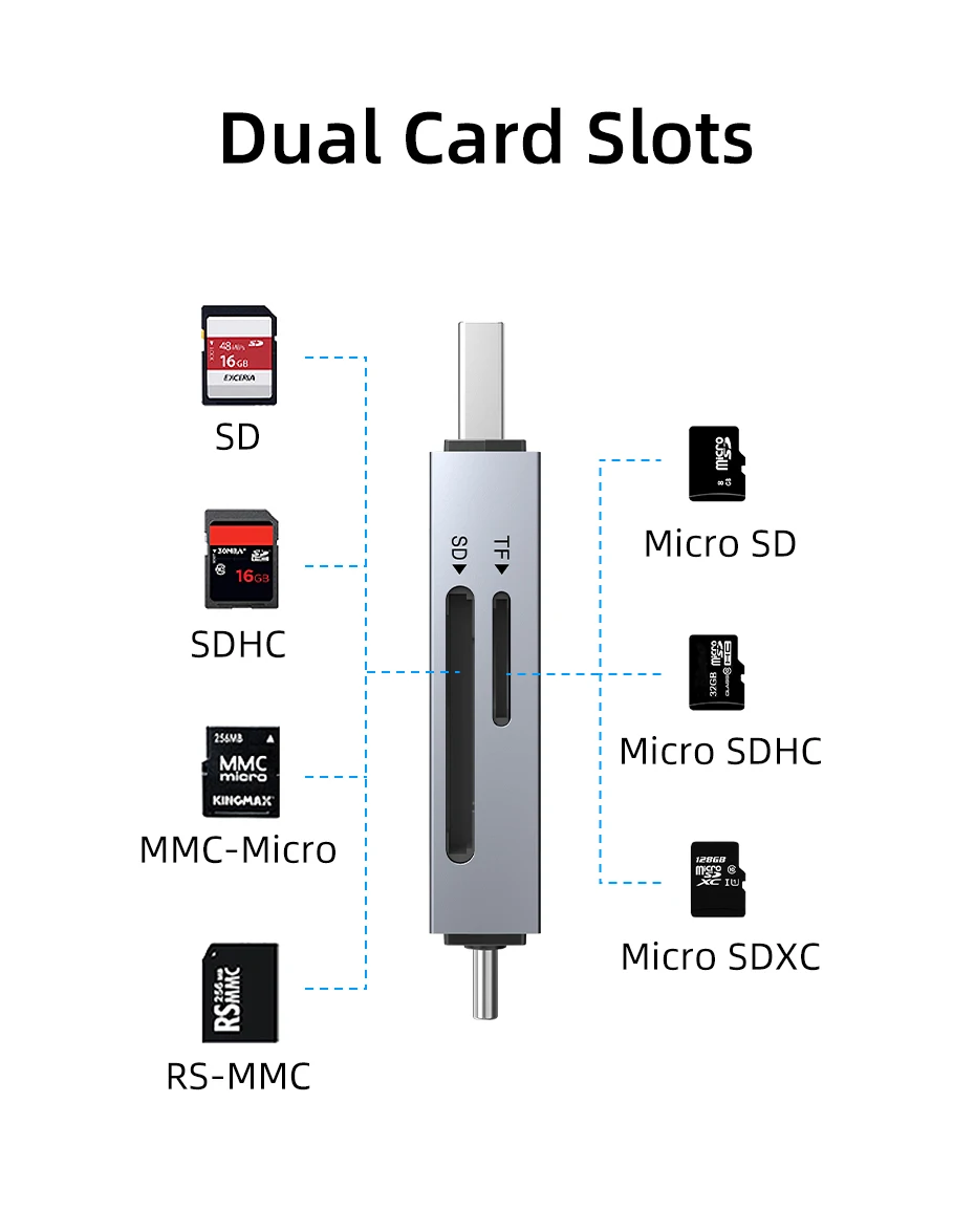 El lector de tarjetas SD USB tipo C tiene dos ranuras para tarjetas y admite ambos formatos SD + TF3.0, como SDXC, SDHC, SD, MMC, MicroSDXC, MicroSDXC, MicroSD, MicroSDHC y tarjetas de la serie 1: 1. Cámara. Es ideal para descargar desde cámaras, GoPros y más a tu MacBook, iPad o iPhone. 15. Permite leer dos tarjetas simultáneamente, lo que hace que el acceso a los datos sea más eficiente y ahorre tiempo.