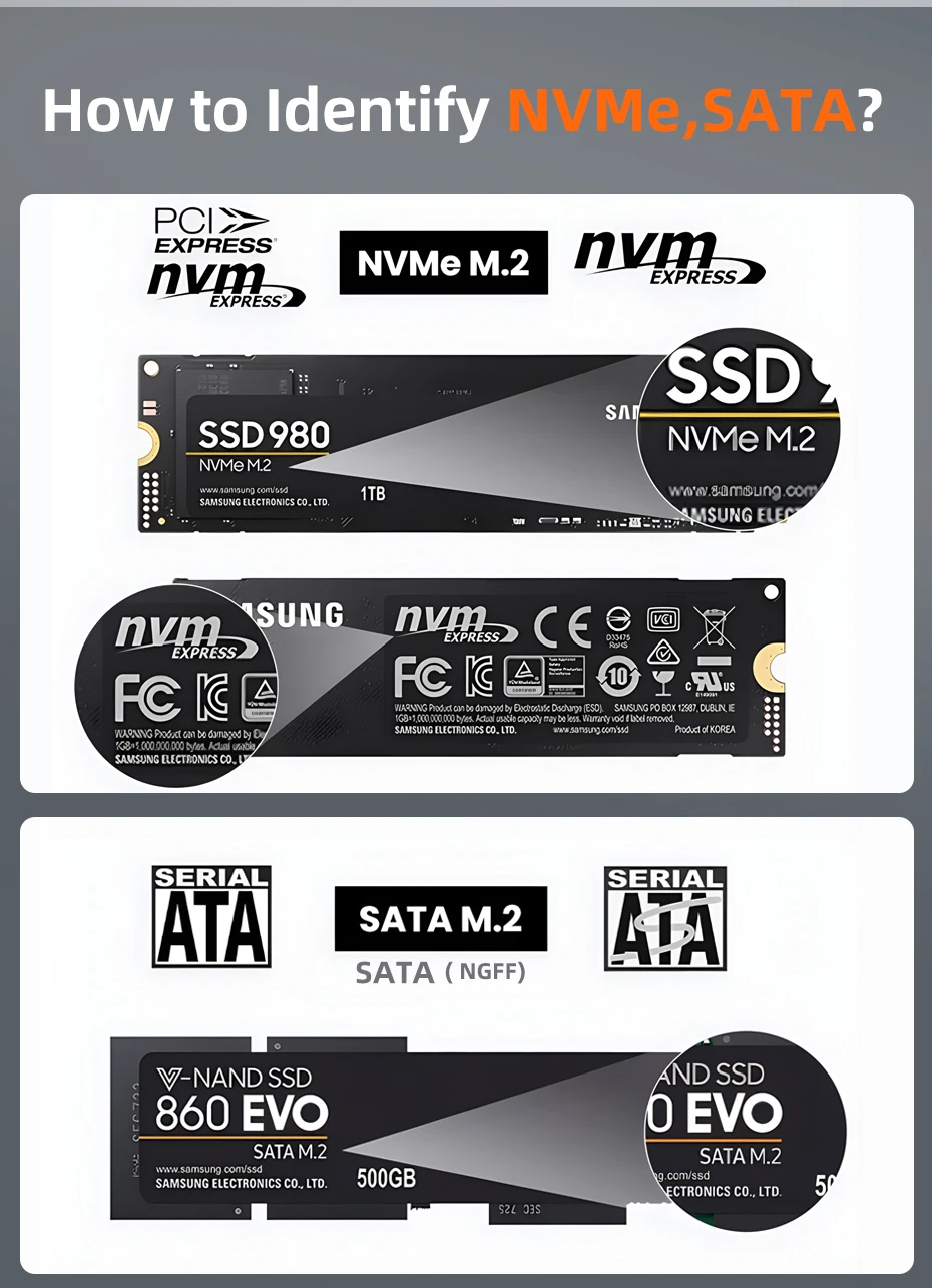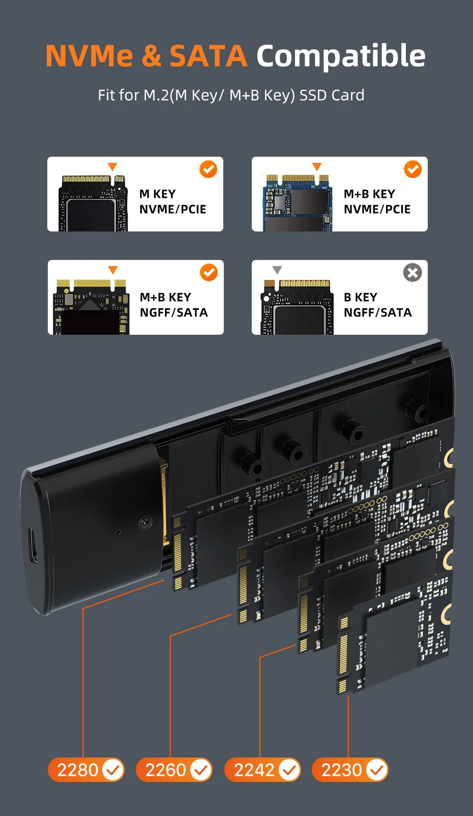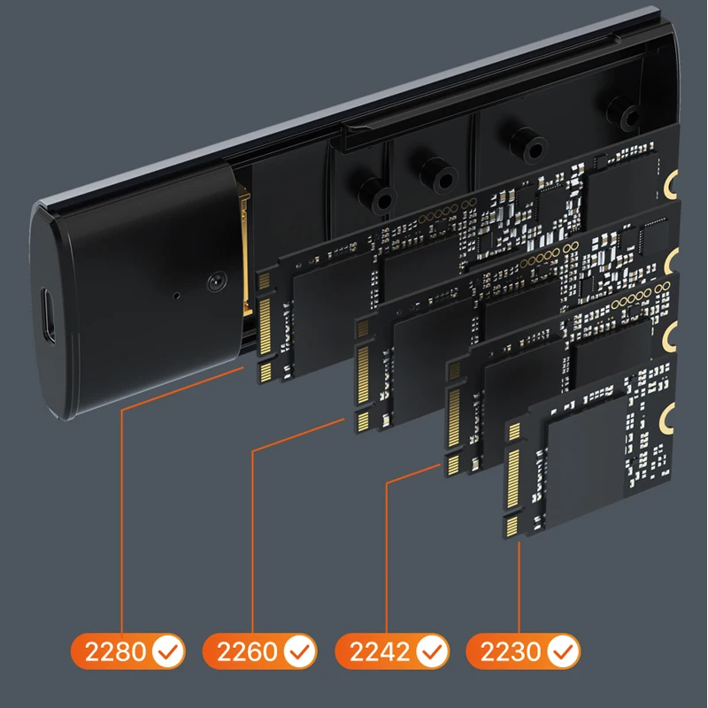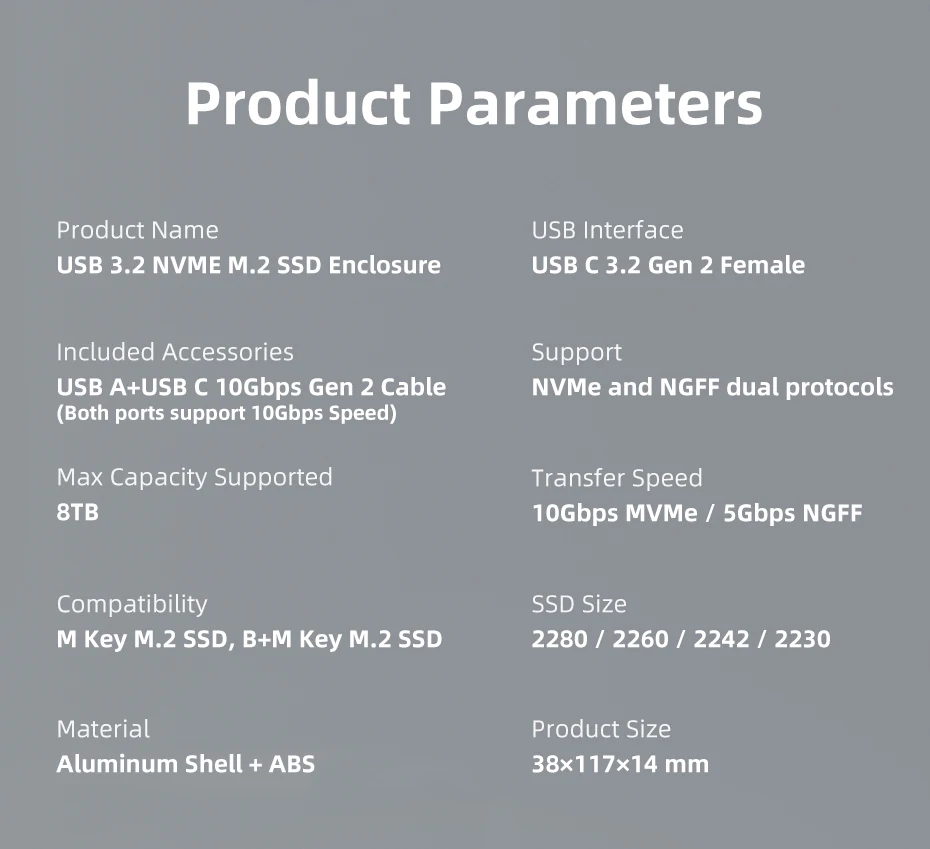 La carcasa SSD M.2 NVMe SATA es compatible con M Key o B+M Key con una capacidad de 2 TB y SSD 2230 /2242 /2260 /2280 de más de 2 TB. y admite múltiples sistemas operativos como Windows, Mac OS, Linux, Android.