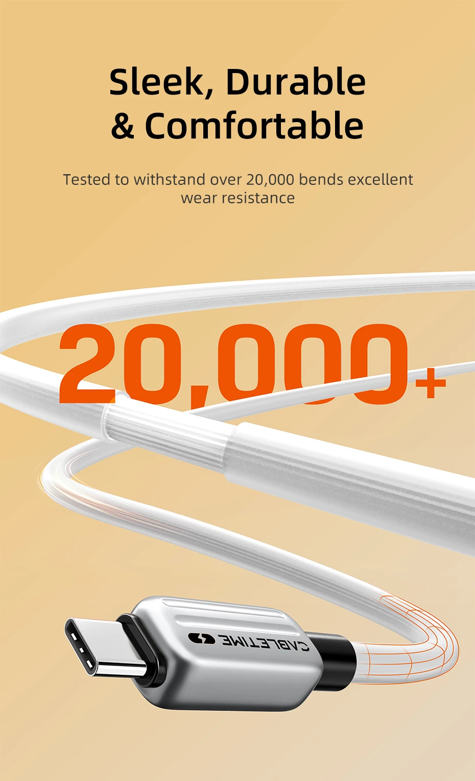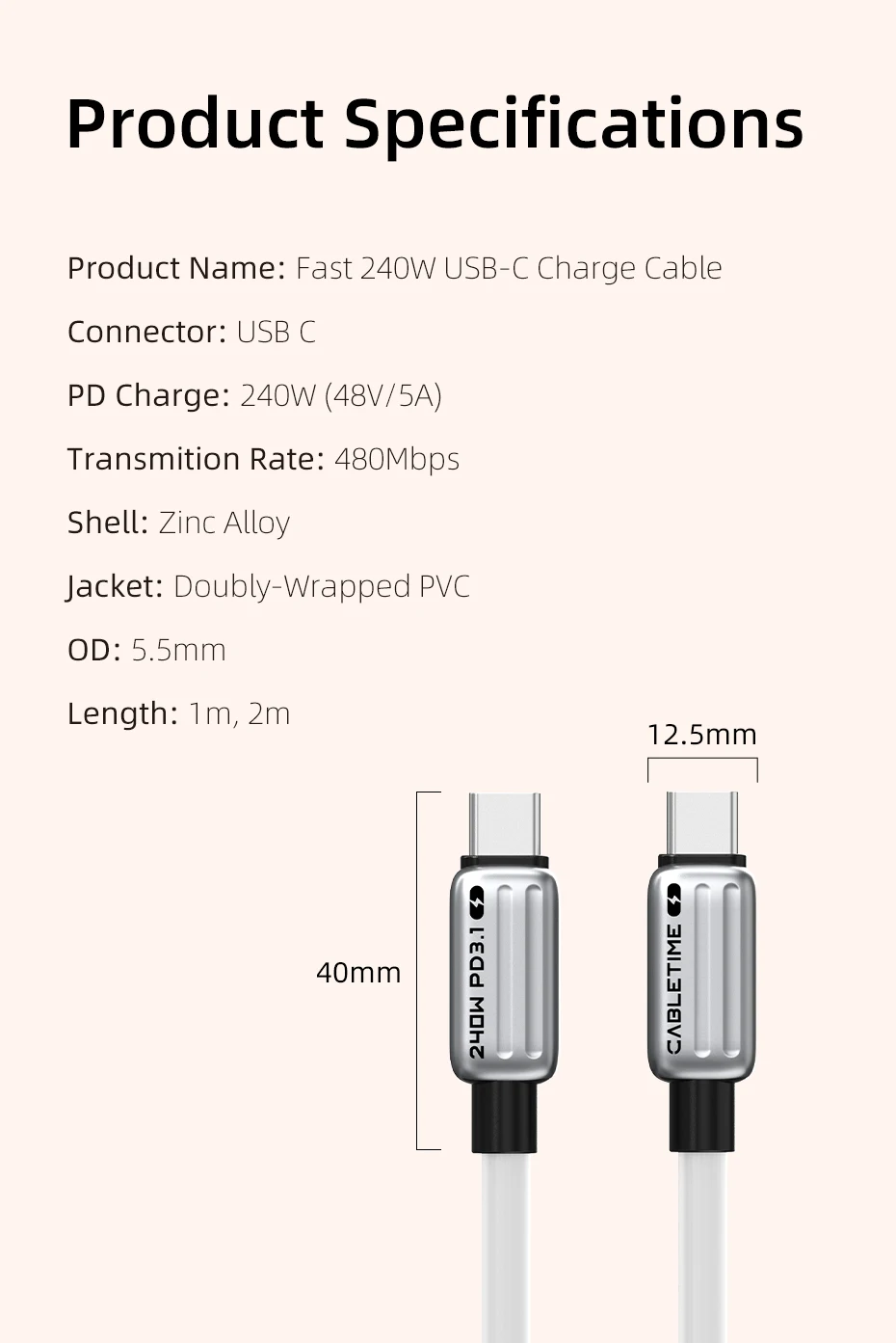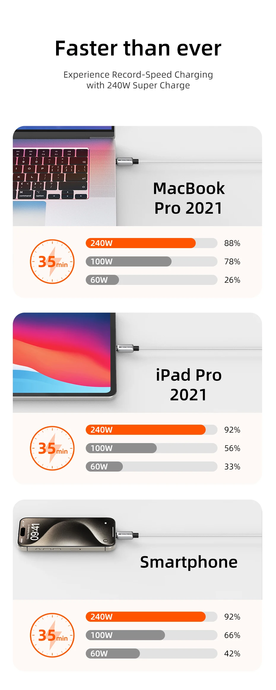Con la tecnología de carga rápida PD 3.1 y QC 4.0, el cable de carga rápida USB C Cabletime admite una impresionante salida de 240 W (48 V/5 A).Carga rápidamente un iPhone del 15 al 85%, un MacBook Pro al 88% y un iPad Pro al 92% en menos de 35 minutos.Además, es compatible con adaptadores USB-C Power Delivery que van desde 30 W hasta 140 W, lo que garantiza que se pueda cargar una amplia gama de dispositivos de manera eficiente y segura.