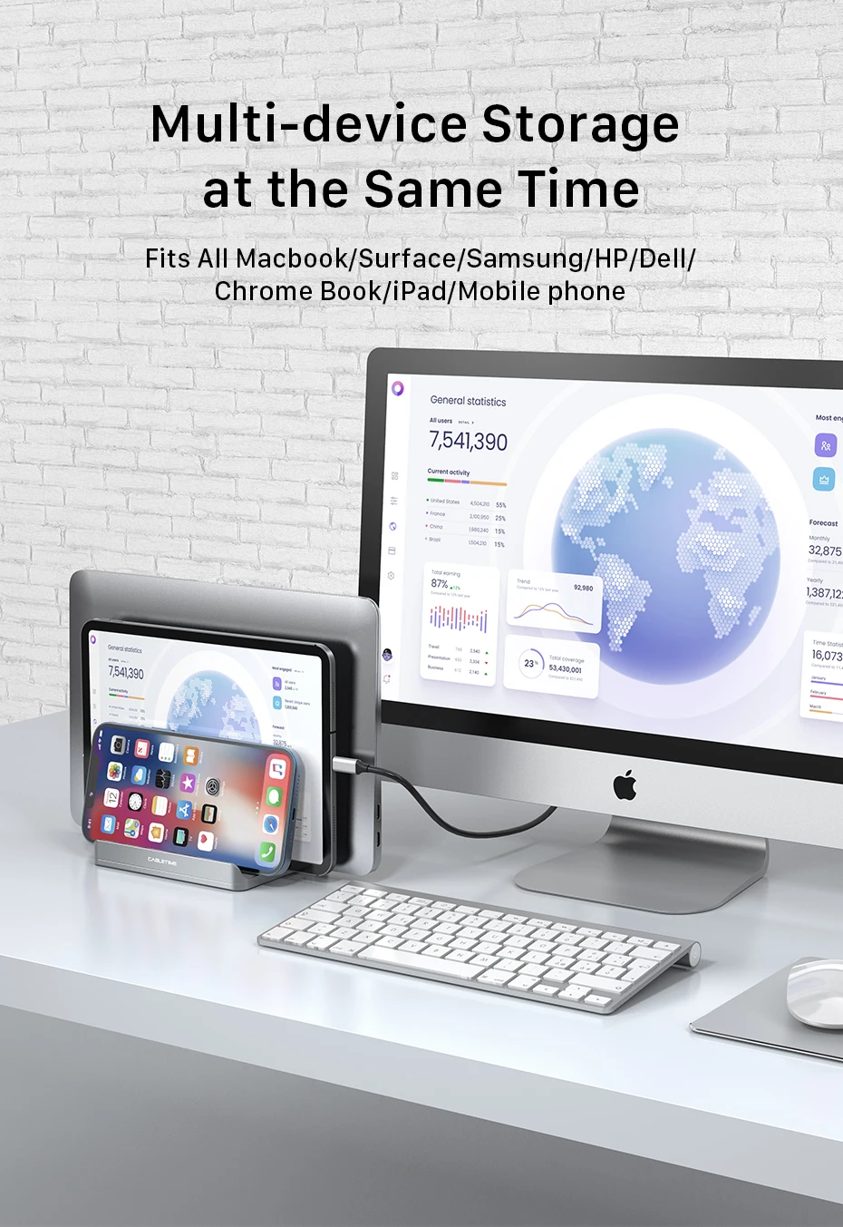 Se pueden colocar dos computadoras portátiles (teléfonos y tabletas) en el soporte vertical para computadora portátil al mismo tiempo para crear un escritorio limpio y organizado.También mantenga sus dispositivos alejados de derrames/p