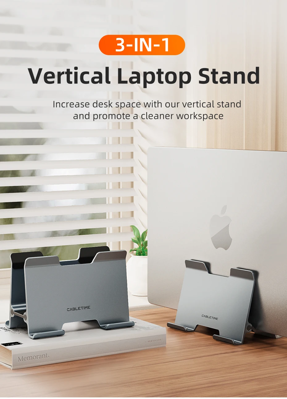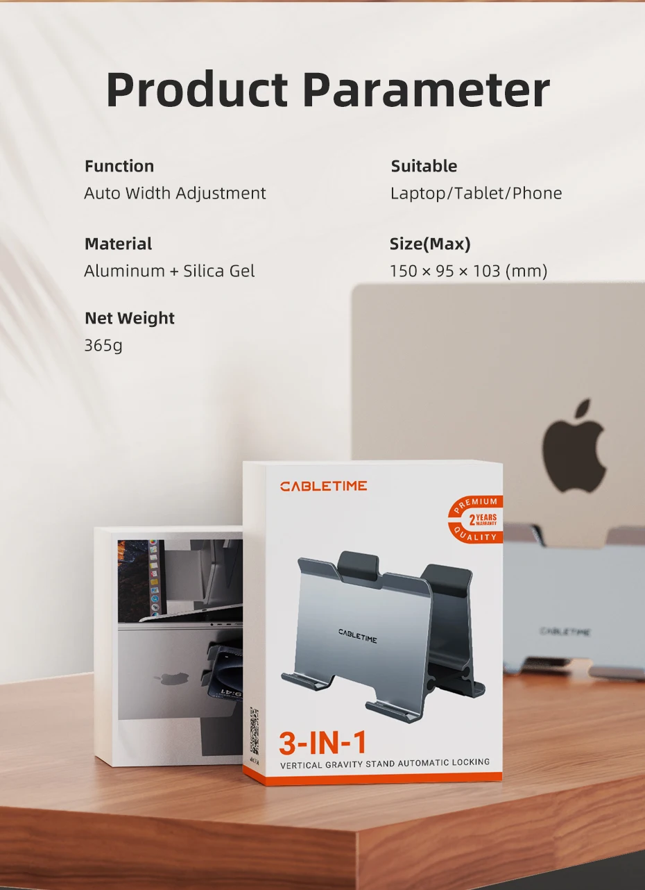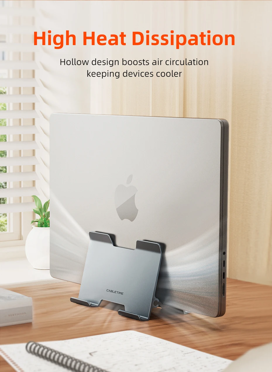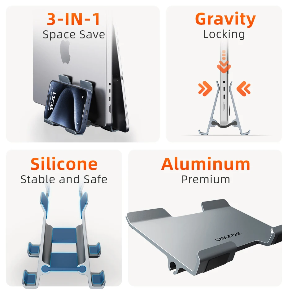 El soporte para portátil Cabletime Gravity es una adición esencial a cualquier escritorio. Su elegante diseño vertical no solo ahorra un valioso espacio en el escritorio, sino que también asegura sus dispositivos con una abrazadera de gravedad inteligente. Fabricado con aluminio de primera calidad y reforzado con gel de sílice suave, este soporte se ajusta automáticamente al ancho de su ordenador portátil para un ajuste cómodo y seguro. Simplifica su espacio de trabajo y garantiza que sus dispositivos estén organizados, sean accesibles y se presenten con elegancia moderna.