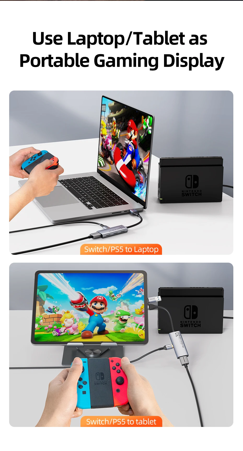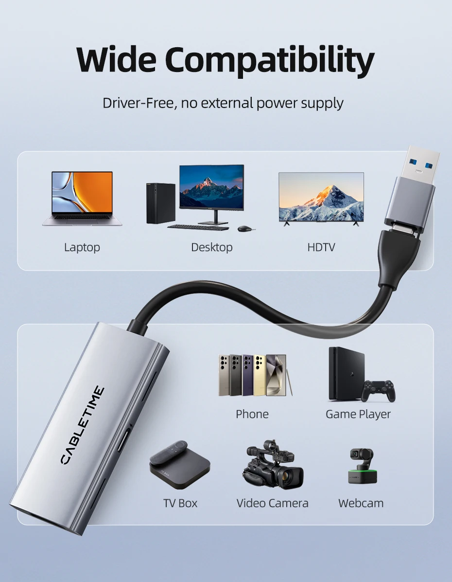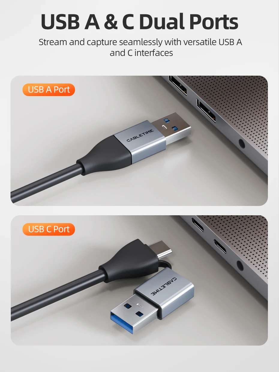 Featuring USB-A and USB-C dual interfaces, this capture card meets the needs of both older and newer devices, offering universal compatibility with laptops, mobile phones, tablets,cameras and other devices . Whether you're streaming a console game, hosting a live event, or using a tablet as a camera monitor, this capture card ensures seamless connectivity without interface mismatches.