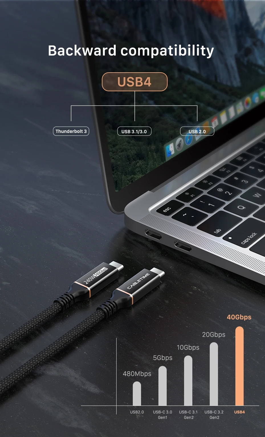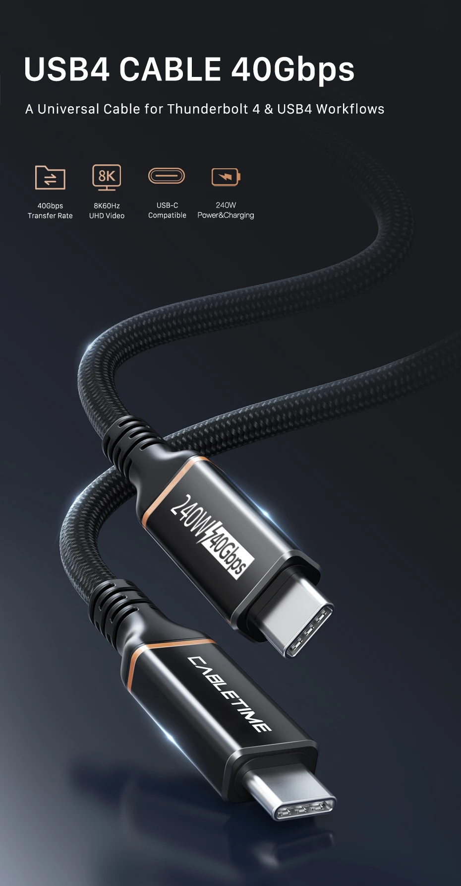 El cable CABLETIME USB 4 admite la transferencia de datos de hasta 40 Gbps y carga hasta 240 W, 8 veces más rápido que los cables USB-C estándar.Todo totalmente compatible con USB-C.