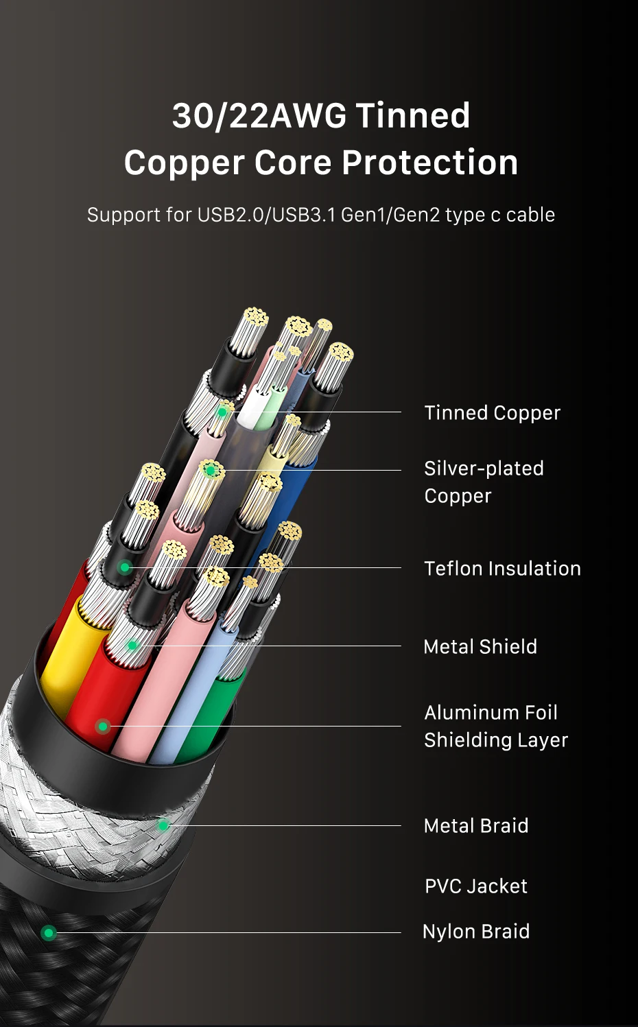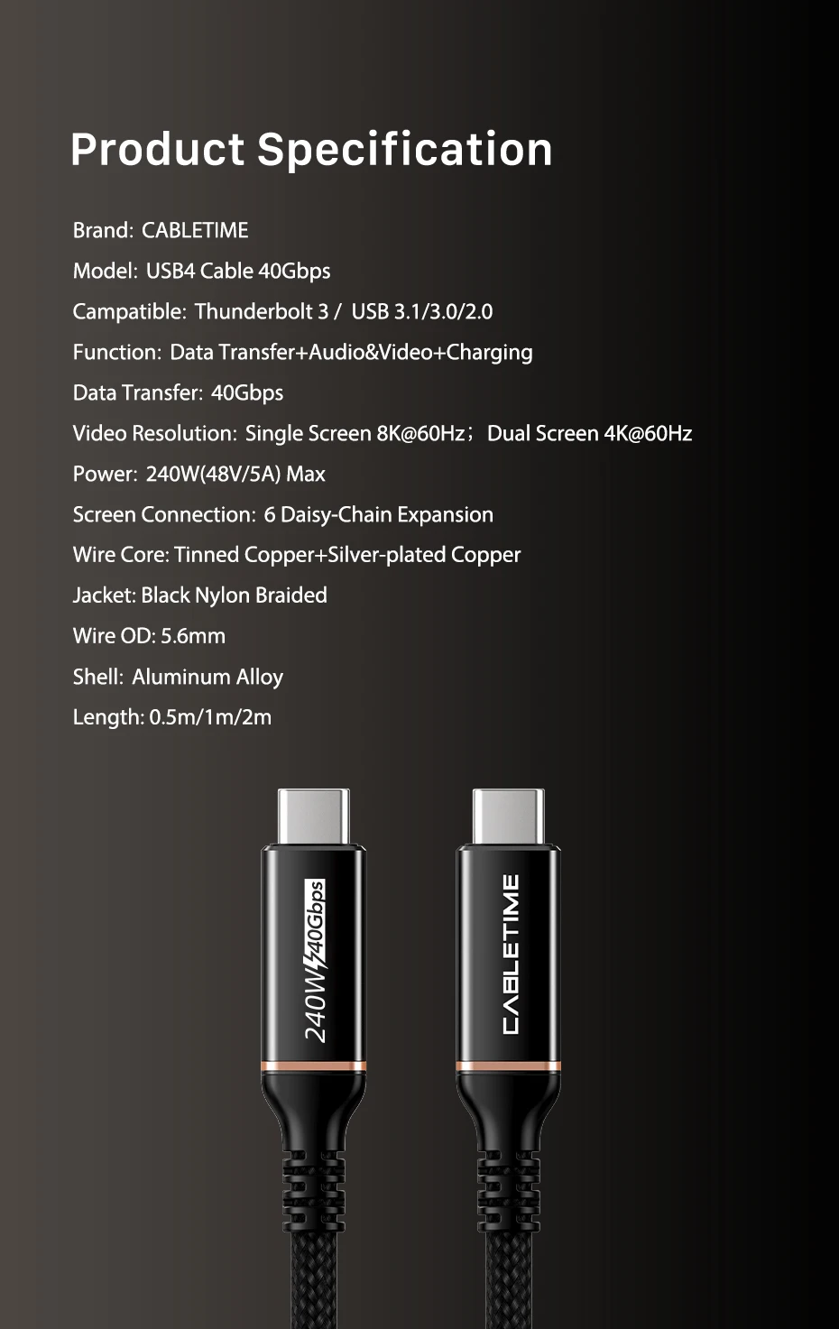 Utilizamos el mejor chip, cable y proceso de producción de Cypress para alcanzar 40 Gbps.Conector de aluminio 3D mejorado, cable trenzado de nailon de primera calidad que agrega durabilidad adicional y no se enreda.El diseño especial de alivio de tensión puede soportar más de 15000 pruebas de flexión.