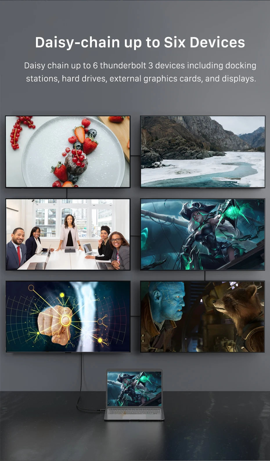 Encadene hasta 6 dispositivos Thunderbolt, incluidas estaciones de acoplamiento, discos duros, tarjetas gráficas externas y pantallas.Al disfrutar de una resolución de video ultra HD, el ancho de banda de 40 Gbps permite vídeo dual 4K@60 Hz o salida única de 8K@60 Hz. Los cables de velocidad de 40 Gbps son adecuados para eGPU y escenarios de visualización dual 4K.
