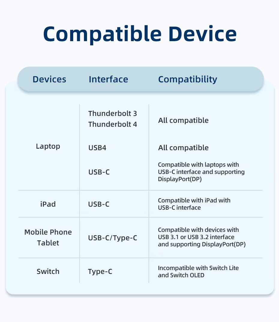 1.PD100W, QC4.0 QC3.0 20V 5A Super carga2,20 Gbps, velocidad de lectura de hasta 1 GB/s3.Función de vídeo, expansión de pantalla 4K 60Hz