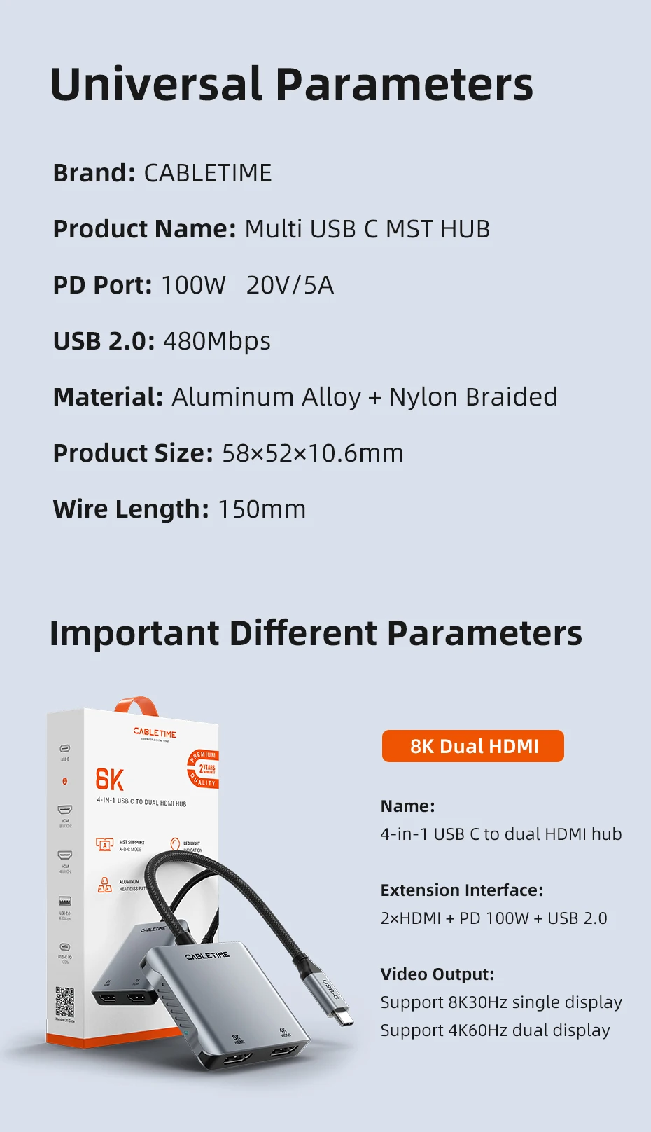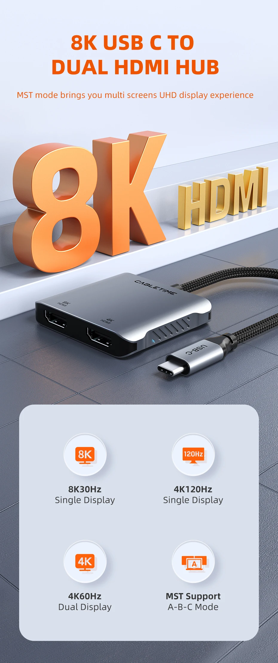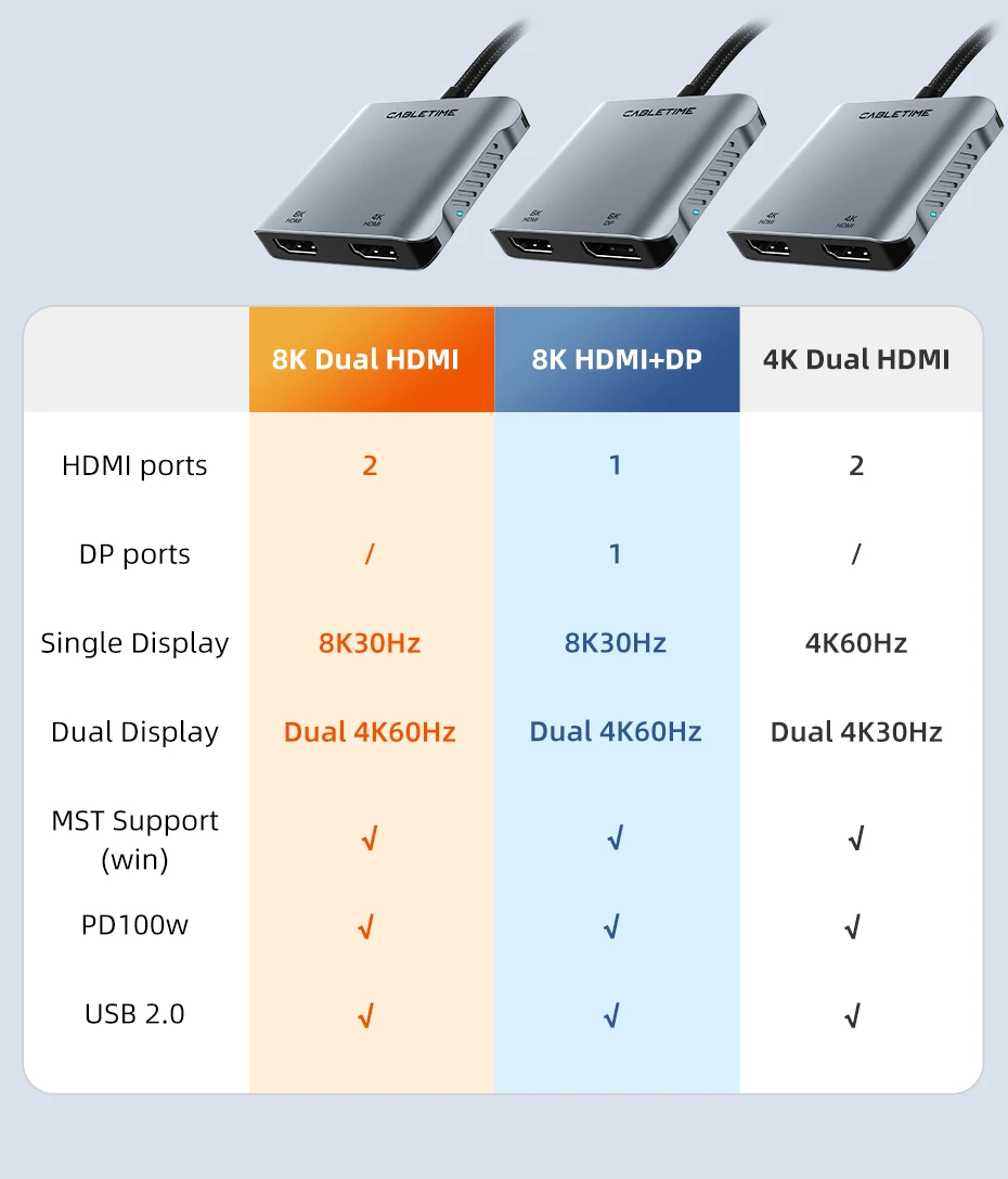 Comprar CABLETIME USB C a HDMI Hub MST 4K 8K tipo C a adaptador HDMI Dual divisor multi transmisión PD 100w base de pantalla Dual para Mac portátil