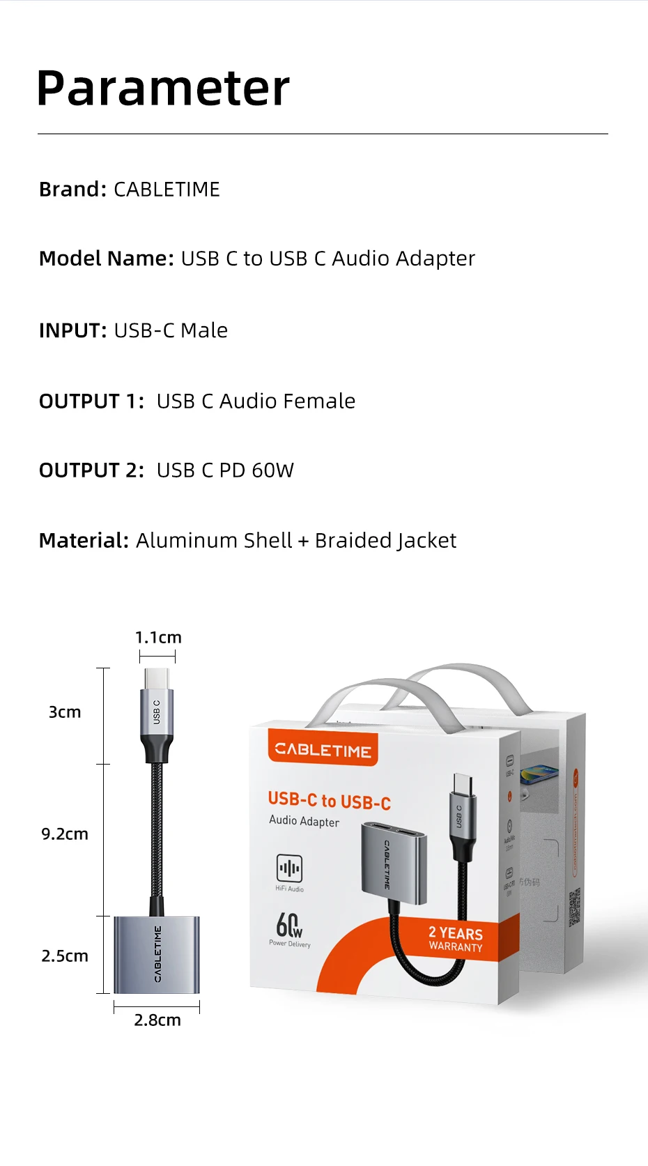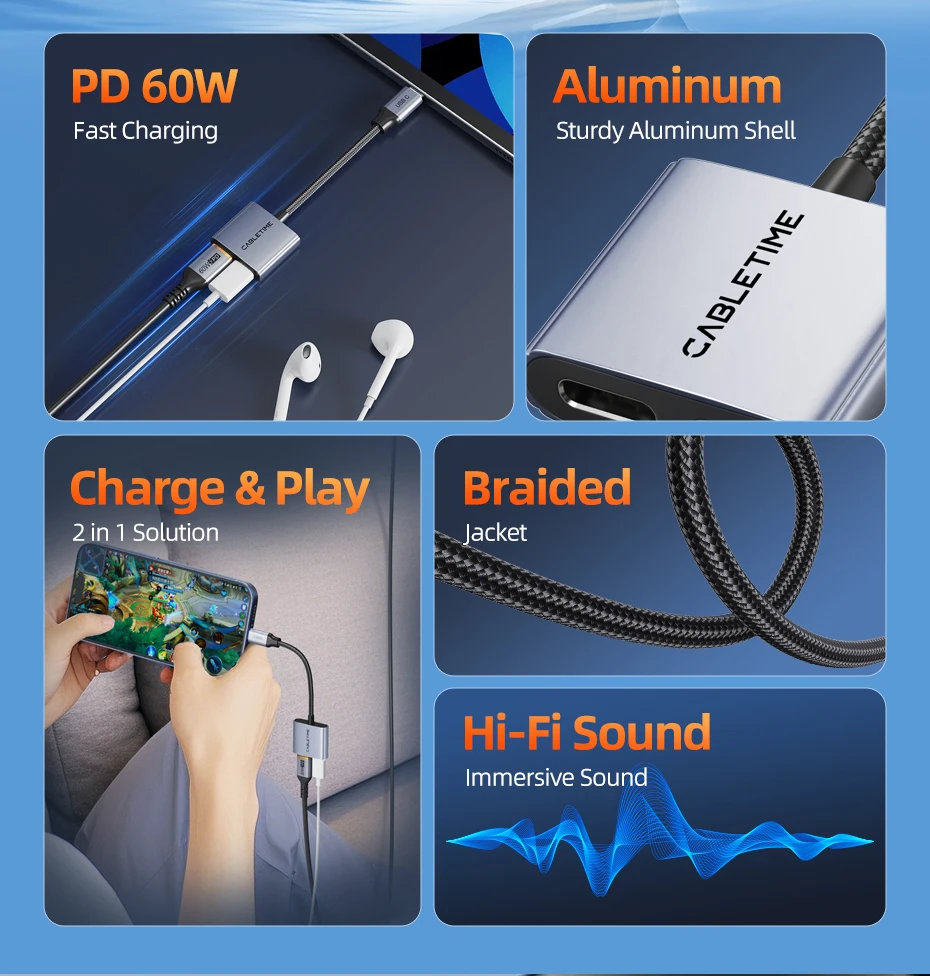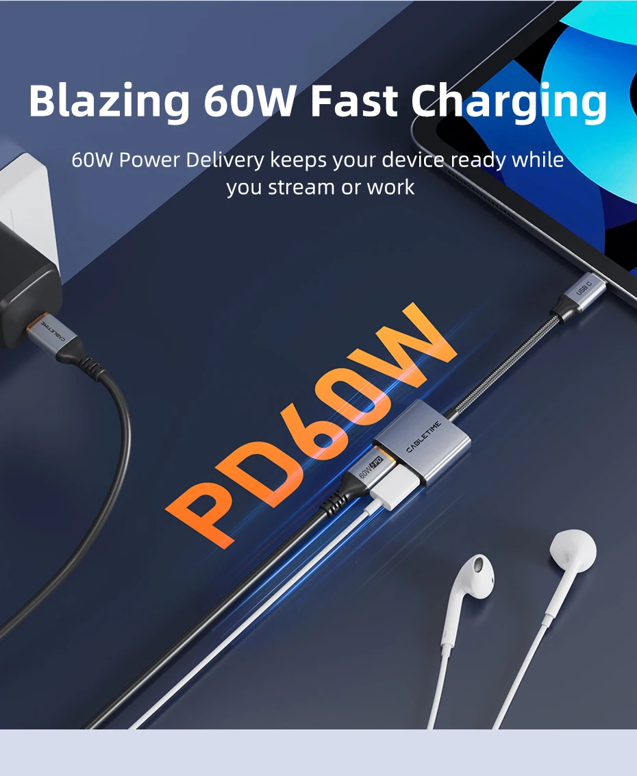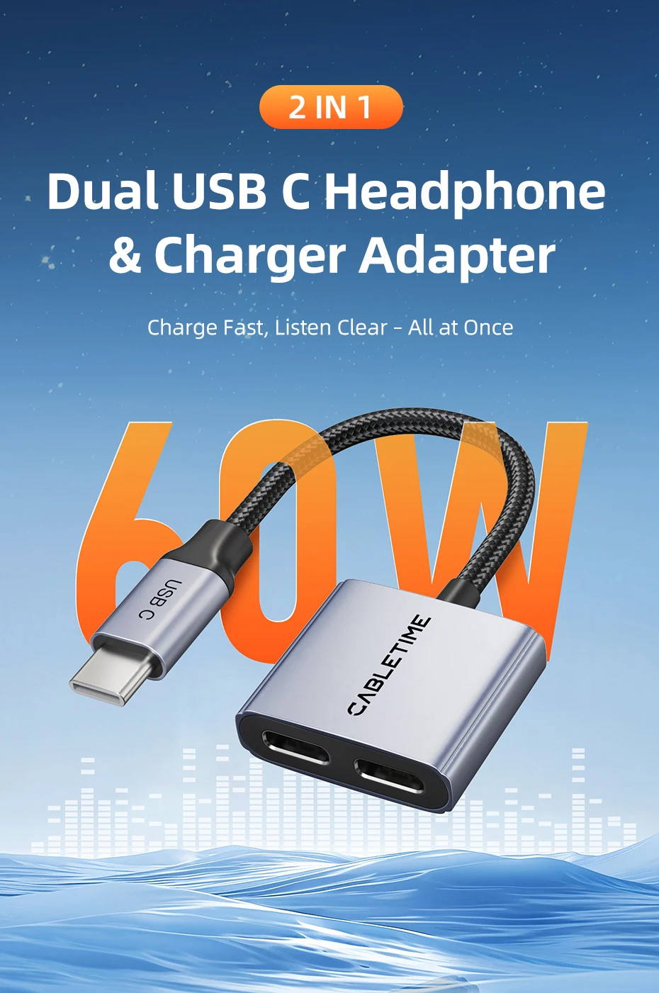 CABLETIME USB C a Dual USB C Adaptador de cargador y auriculares 2 en 1 PD 60W Cargador rápido Adaptador de aluminio Hi-Fi para IPhone HUAWEI