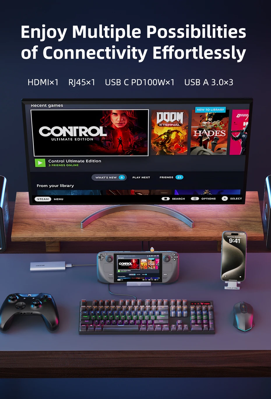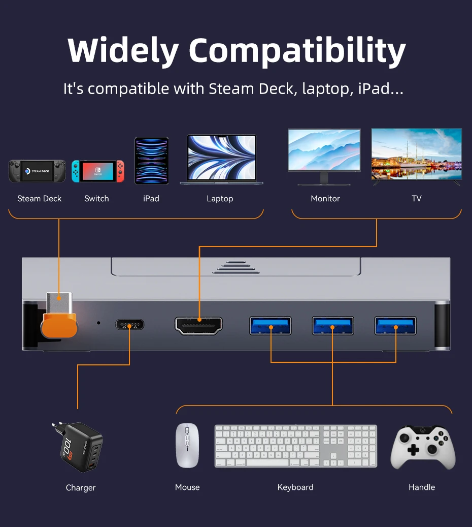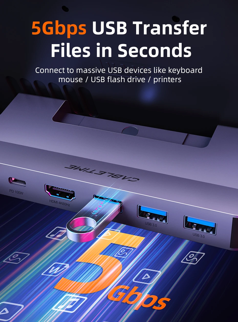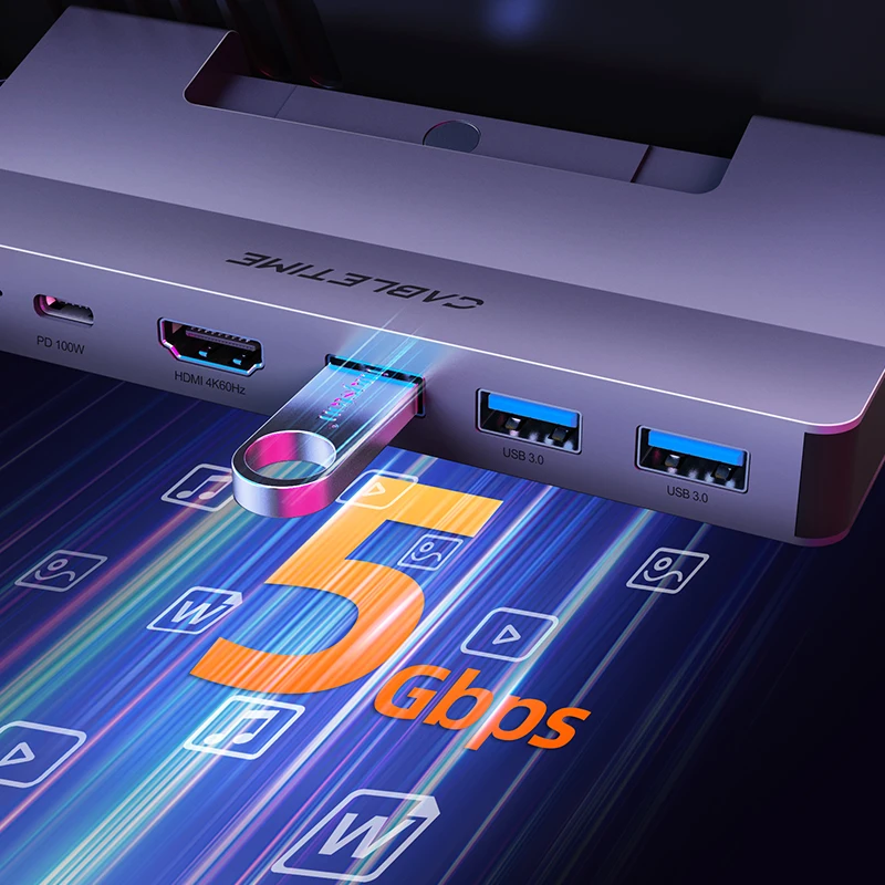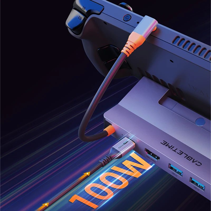 With three USB-A ports supporting fast 5Gbps data transfer, Cabletime steam deck dock usb c speeds up your data transfer. Easily connect a wide range of USB devices including keyboards, mice, flash drives, hard drives and more for fast data movement and seamless device interaction. With 5Gbps speed, file transfers and device synchronisation are faster and more efficient, enhancing your gaming and computing experience.