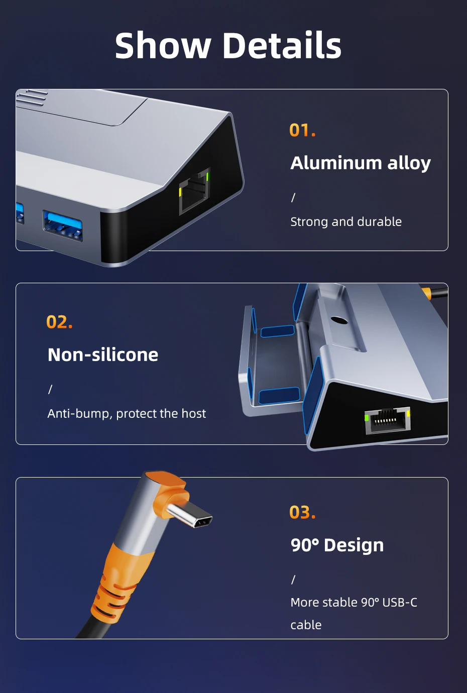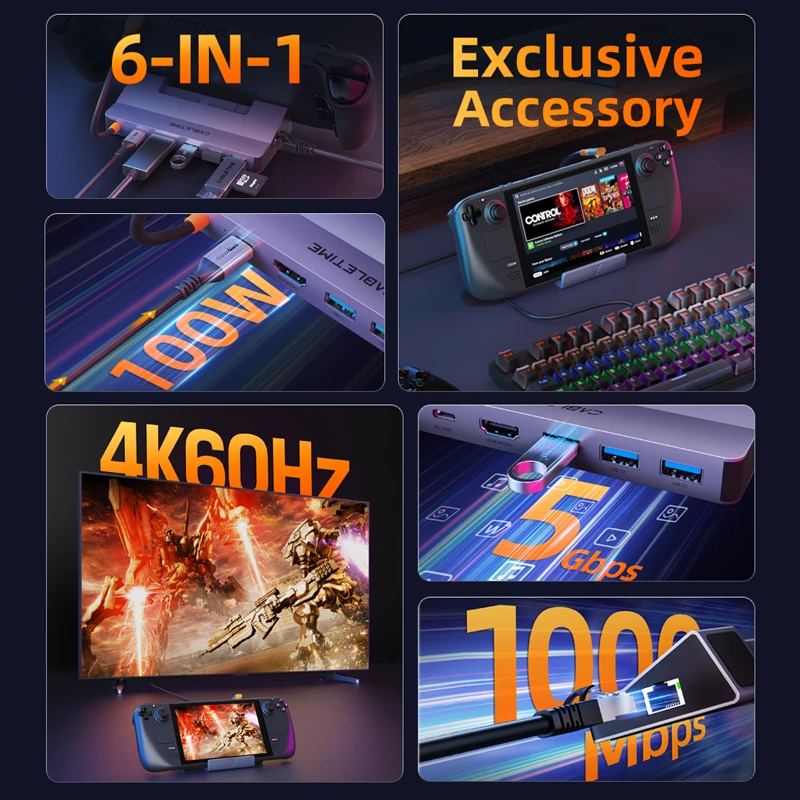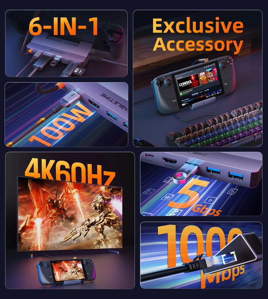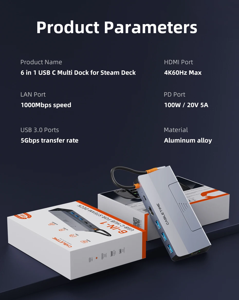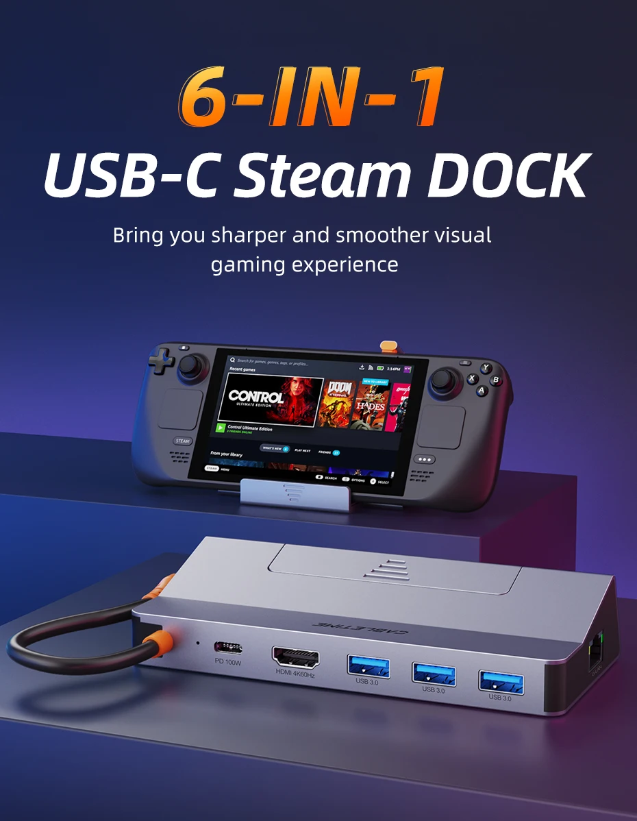Upgrade your Steam Deck with our versatile 6-in-1 USB-C Dock. This powerhouse hub features a 1× HDMI port with 4K60Hz support for an ultra-sharp display, three USB-A 3.0 ports for fast 5Gbps data transfer, a USB-C PD port for 100W fast charging, and a 1× 1000Mbps Ethernet port for a fast, stable internet connection. It's the ultimate all-in-one solution for expanding your device's capabilities and taking your gaming or work setup to the next level.