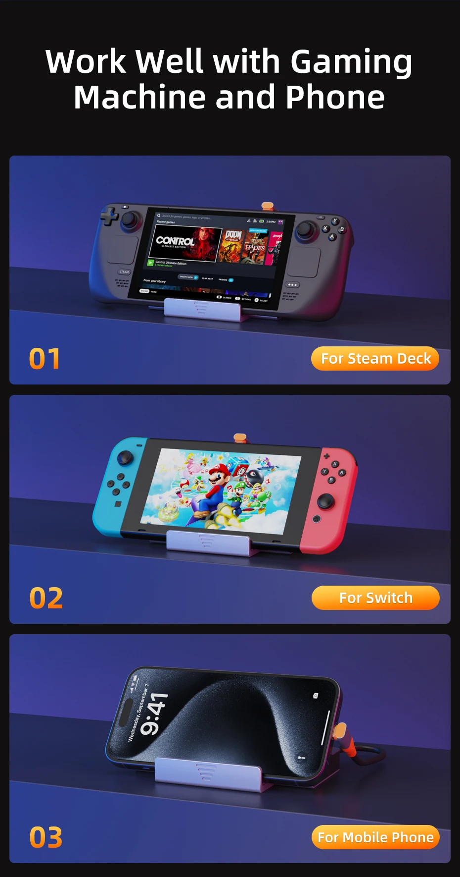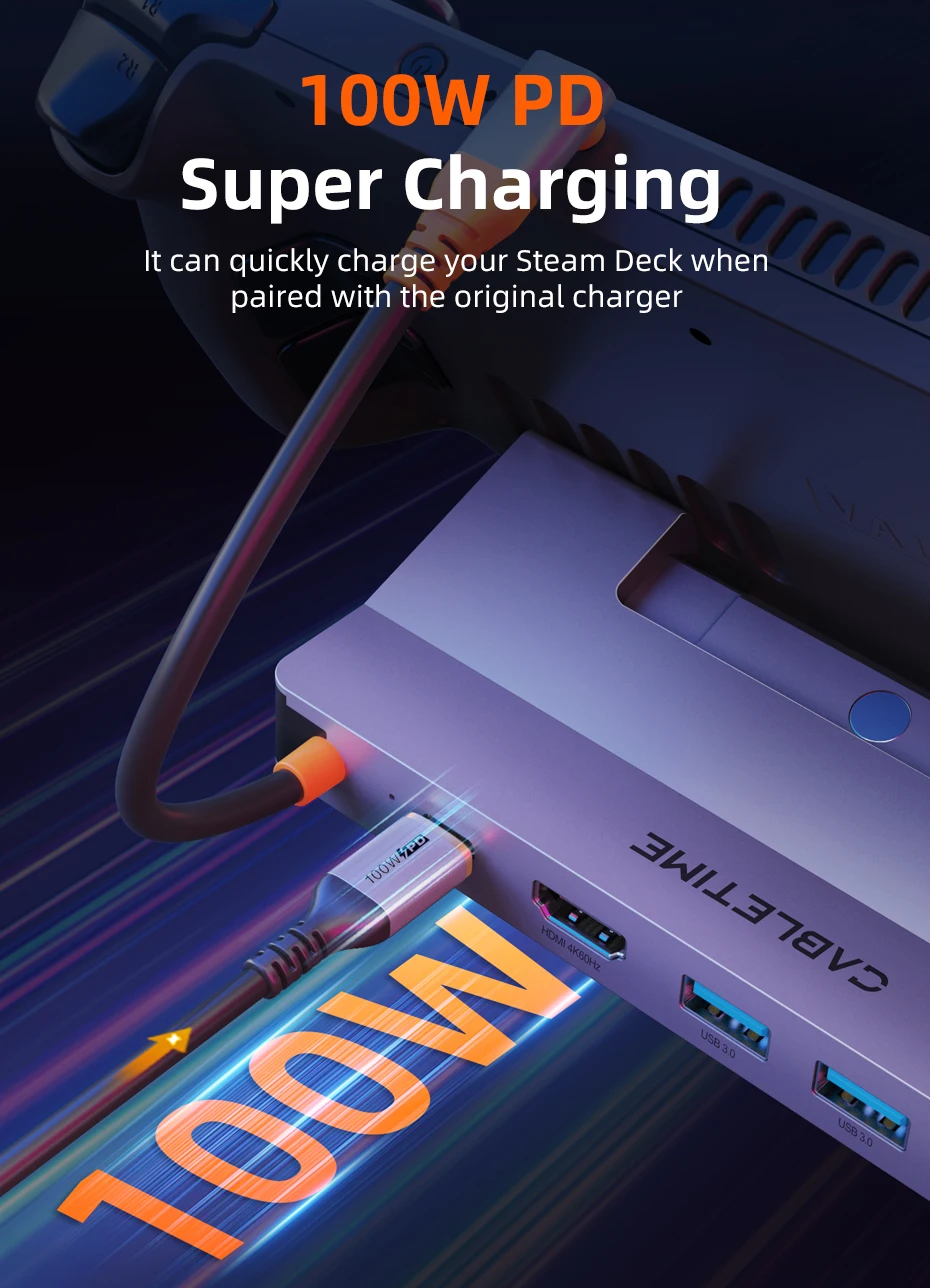Keep your gameplay uninterrupted with our Steam Dock, which features a USB-C PD port for 100W fast charging. When used with the original charger, it ensures your Steam Deck charges quickly and efficiently, keeping you in the game without long interruptions.