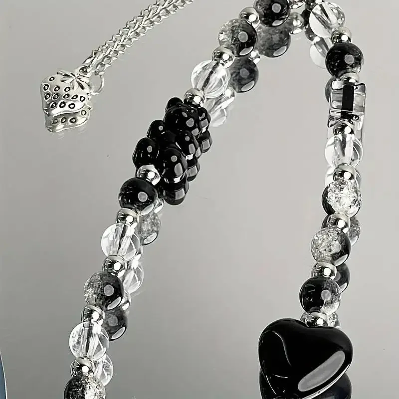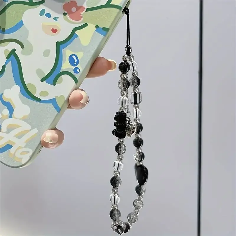 Cadena de teléfono de amor de oso de fresa negra, correa para la muñeca, cordón para teléfono móvil, llavero para chica, cadena colgante para funda de teléfono móvil