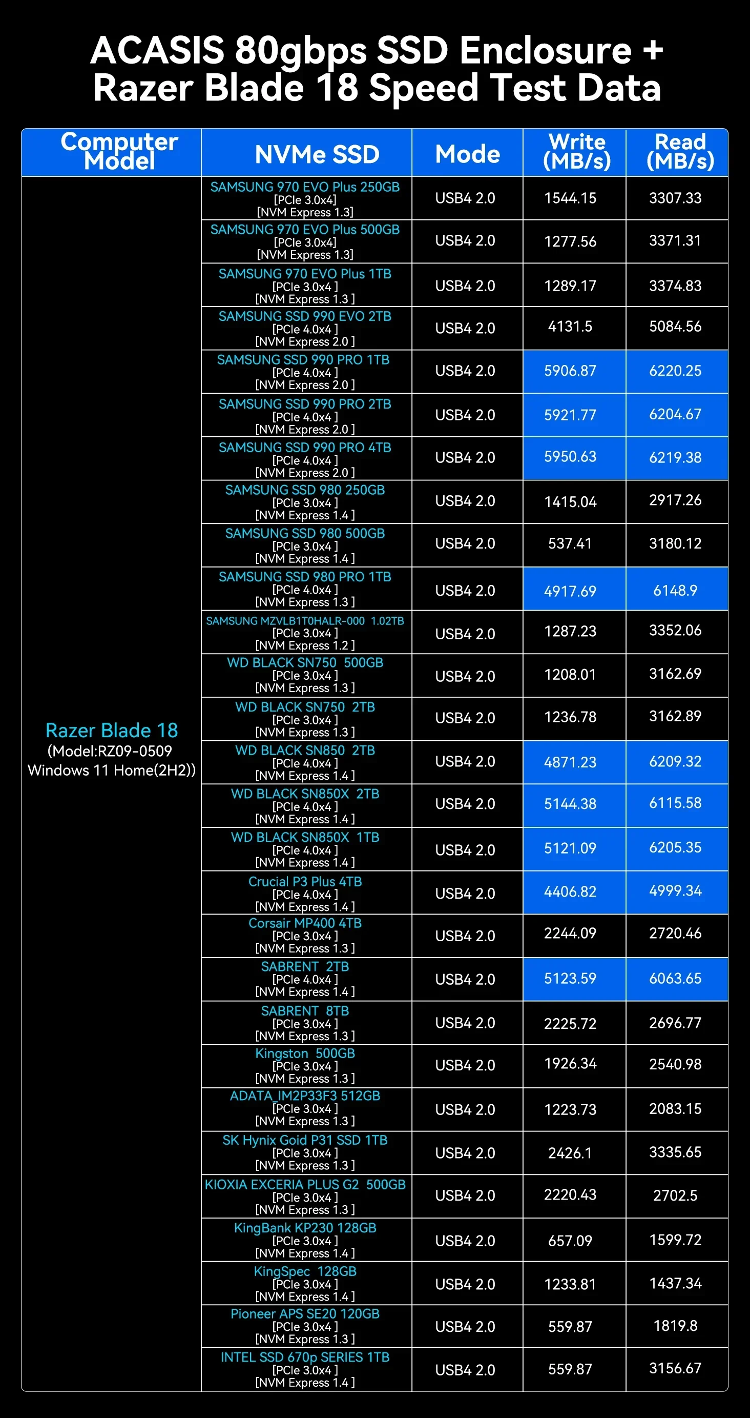 Para lograr una velocidad de 80 Gbps, asegúrese de que su dispositivo tenga la interfaz Thunderbolt 5/USB 4 V2 y que la velocidad también esté relacionada con el SSD; recomendamos encarecidamente el Samsung 990/980 pro/WD SN850.