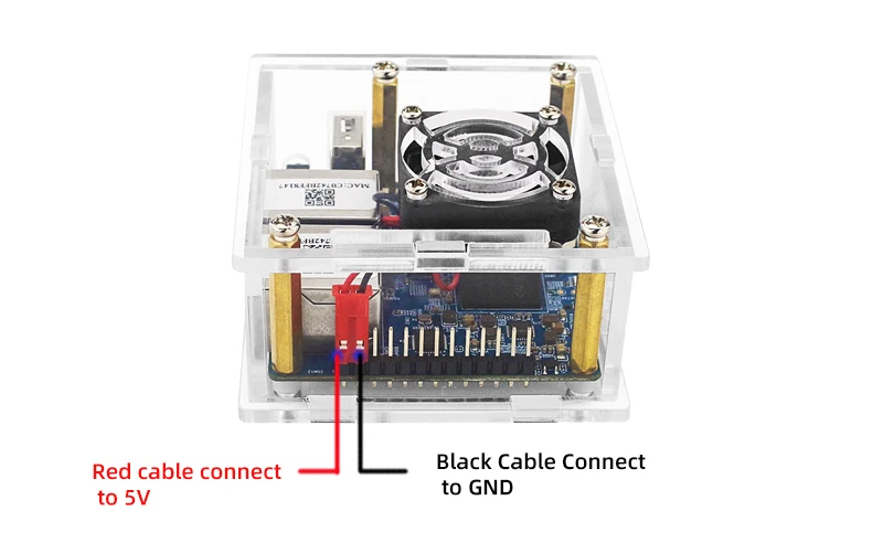 Debe soldar el encabezado GPIO a la placa base en la posición más rápida.Luego conecte el cable rojo del ventilador a la distribución de pines de 5 V, conecte el cable negro a la distribución de pines GND.