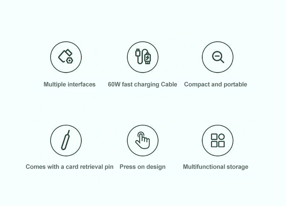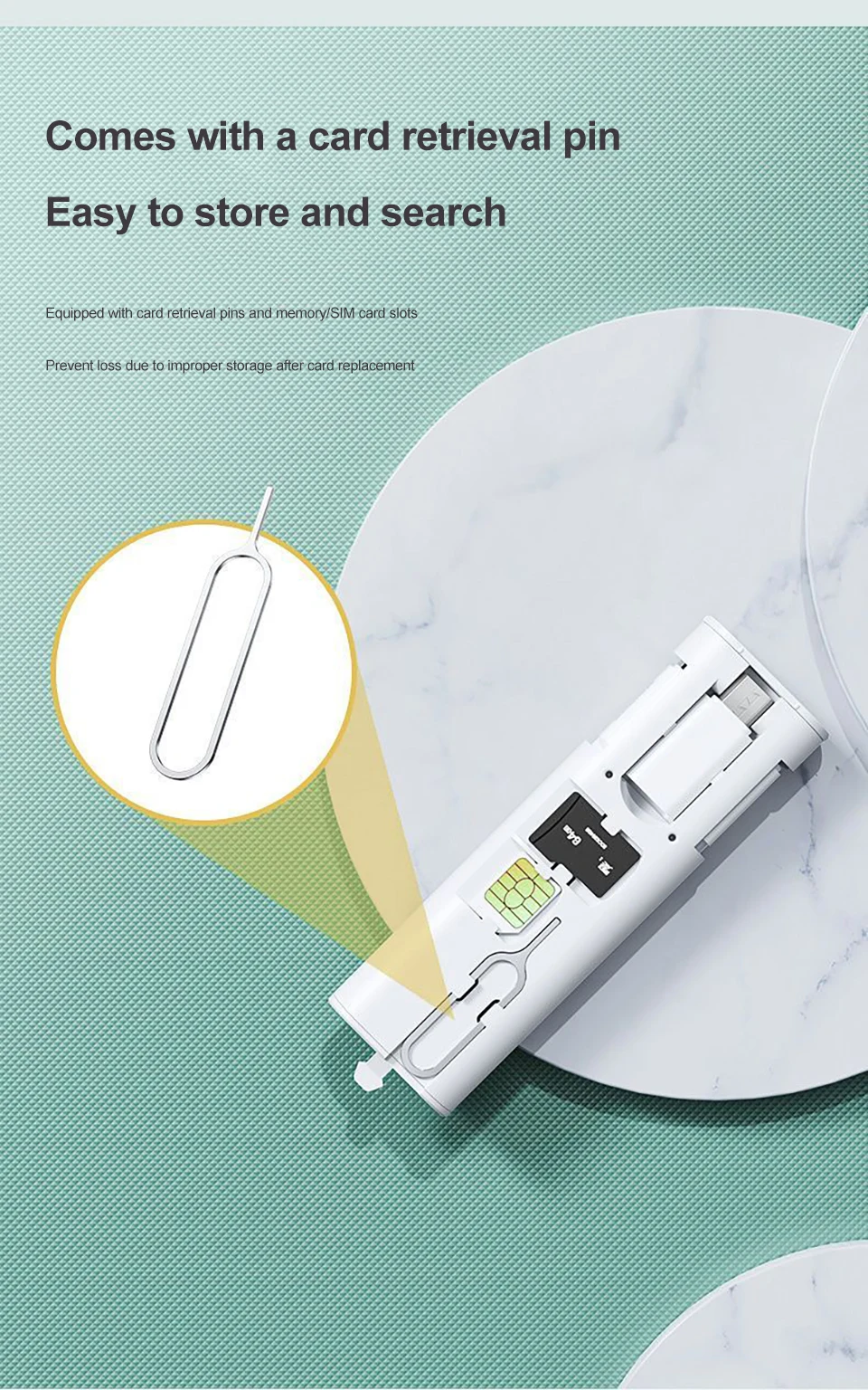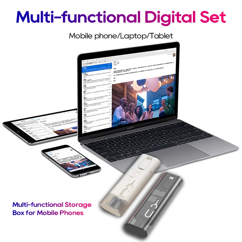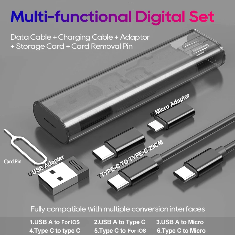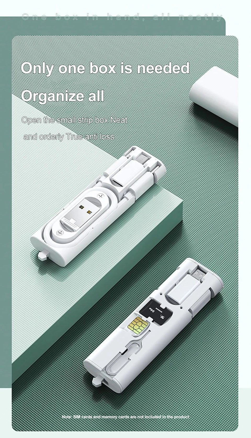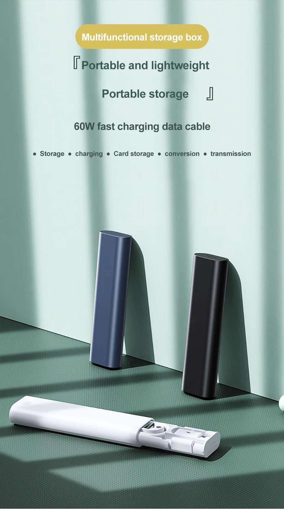 * Estuche de carga de cable multifuncional: carga│Almacenamiento│Transferencia│Conversión│Almacenamiento de tarjetas. *Múltiples interfaces: se pueden cargar dispositivos iPhone, Android y USB-C, lo que hace que sea más conveniente mientras viaja. * Admite salida de alta potencia de 60 W, con cargador de carga rápida que se puede cargar rápidamente para teléfonos móviles/tabletas/dispositivos portátiles *Pin para tarjeta incorporado, ranura para tarjeta de memoria y ranura para tarjeta SIM, fácil de cambiar la tarjeta y guardar la tarjeta para evitar pérdidas. * Diseño de pulsación: se expulsa fácilmente con una sola pulsación para un fácil acceso.