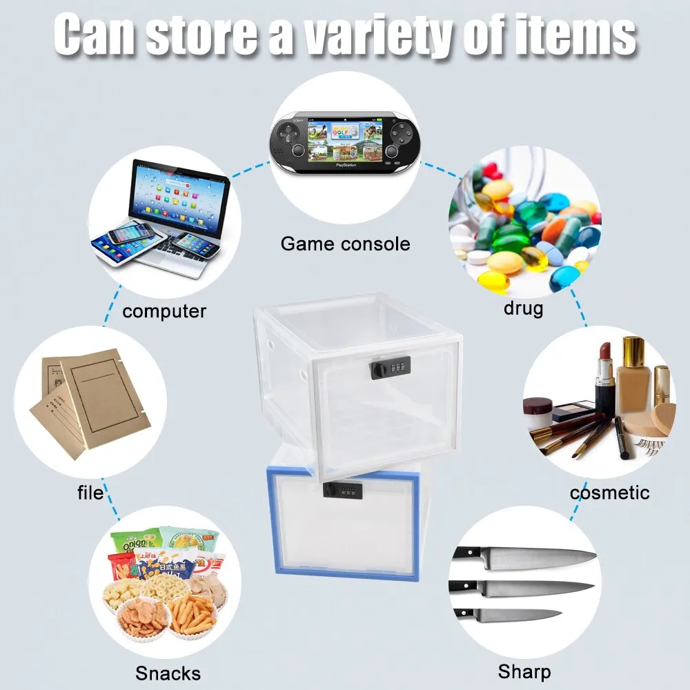 3. materiales de alta calidad: El producto es ligero y fácil de limpiar. Nuestra caja de seguridad está hecha de plástico de policarbonato líder en el mercado, utiliza materiales ecológicos de calidad alimentaria, no contiene BPA y le permite almacenar alimentos y medicamentos con confianza. El material transparente permite que otros puedan verlo, no puedo tocarlo, y ya no me preocupo por tener niños en casa.