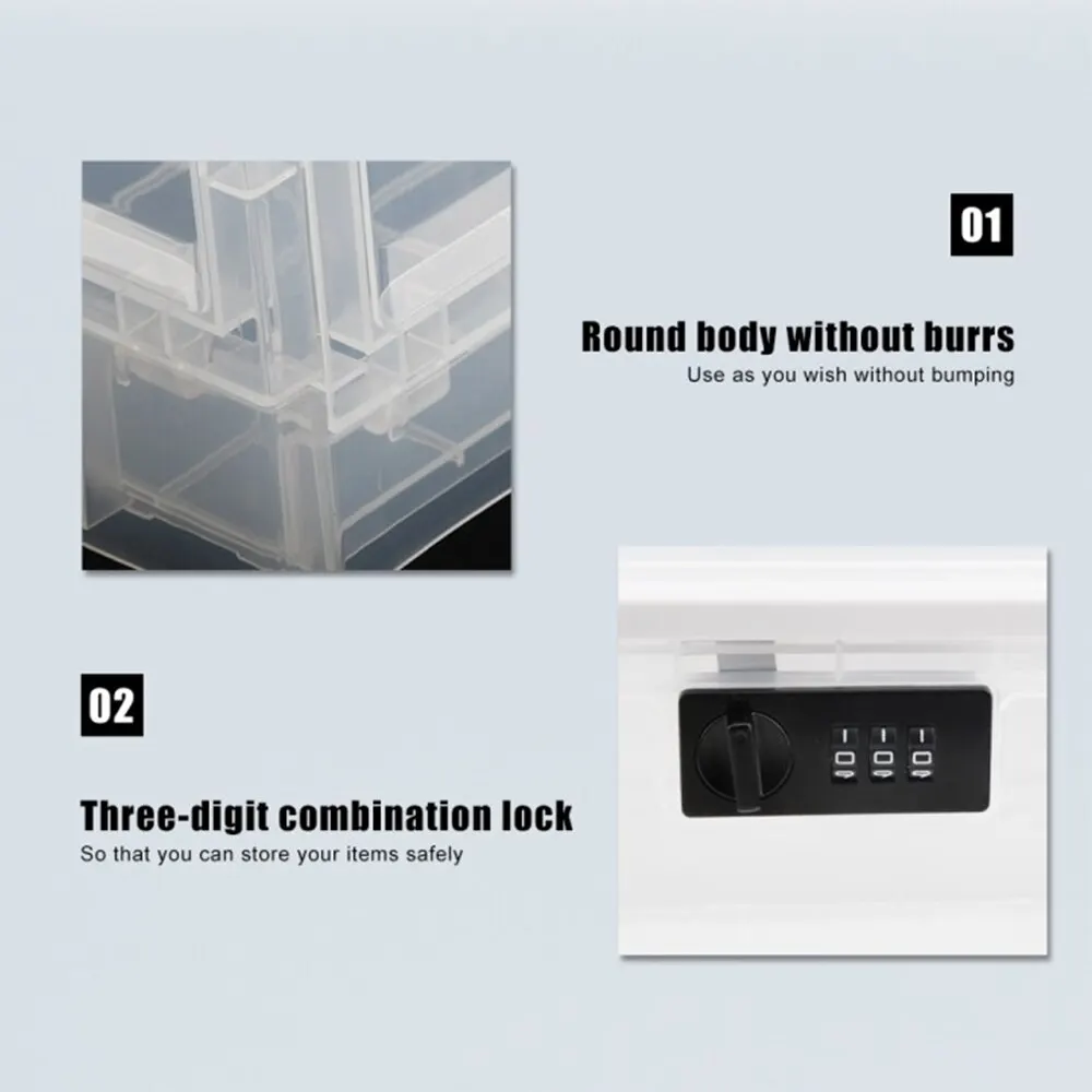 2. Bloqueo de código de seguridad: la cerradura de combinación de código de tres dígitos puede bloquear con seguridad la caja, y la configuración del Código es simple. Siga las instrucciones en el Manual para que pueda almacenar sus artículos de forma segura.