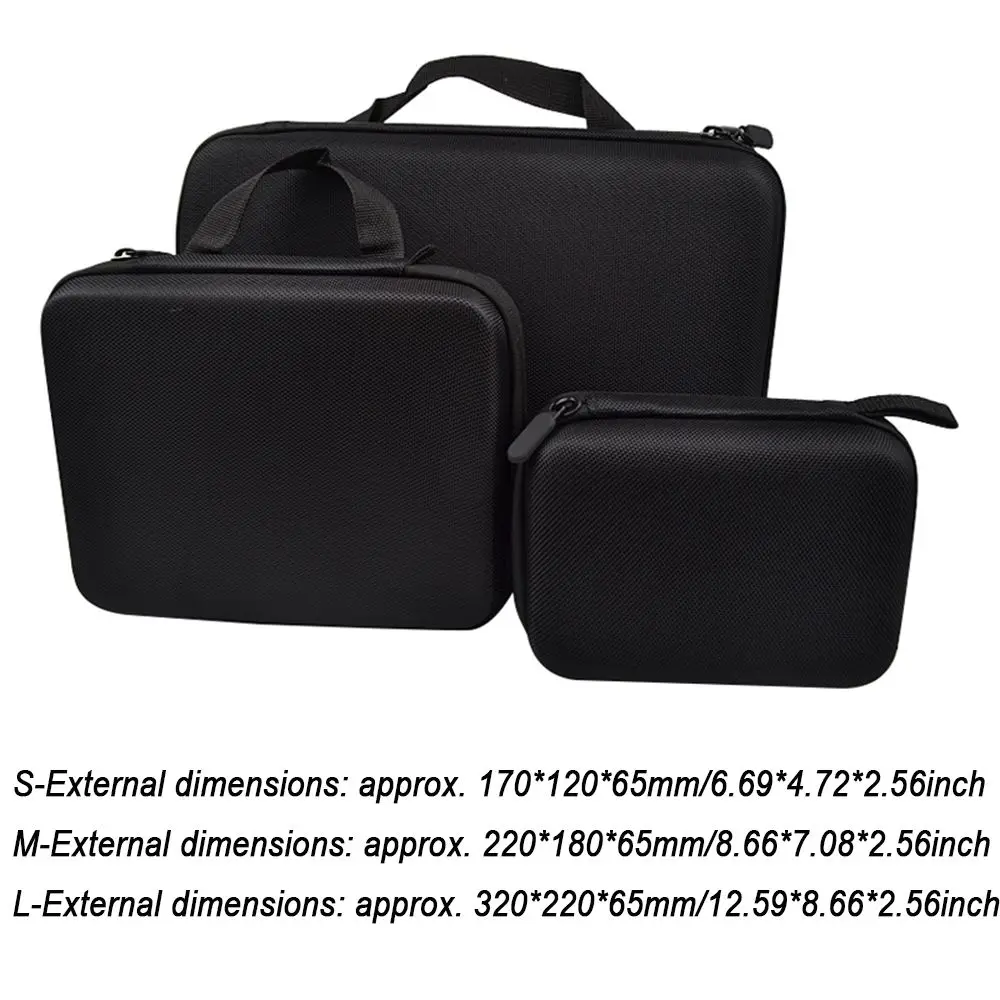 EL TAMAÑO DEL ESTUCHE DE TRANSPORTE CUMPLIRÁ CON SU NECESIDAD: es una buena opción para elegir este estuche de transporte mediano para su cámara de acción y accesorios, hay ranuras precortadas para su cámara de acción, batería recargable, cargador de batería, También puede poner los accesorios según sus necesidades en la ranura más grande y el bolsillo de malla elástica con cremallera está preparado para más de sus dispositivos. CONSTRUCCIÓN DURADERA Y GRAN CALIDAD: el estuche de transporte presenta un exterior duro semirrígido y un interior de espuma de alta densidad. ALMACENAMIENTO EN EL HOGAR Y ESTUCHE DE VIAJE: guarde su cámara de acción y los accesorios en el estuche en casa, manténgalo seguro y sin polvo. Tomando el estuche con su cámara y accesorios, puede disfrutar del maravilloso momento y grabarlo en su cámara. EXPLORE EL MUNDO SIN PREOCUPACIONES: El exterior robusto y la cremallera duradera brindan protección contra peligros externos, interior de espuma de alta calidad para mantener su cámara y accesorios ordenados y seguros en su lugar. Puede llevarlo con el cinturón de mano o la correa del mosquetón puede sujetar su funda a otra bolsa más grande. La pequeña caja de almacenamiento no tiene asa; la Cámara y otros accesorios no están incluidos; Seleccione la opción correcta de acuerdo con sus necesidades antes de realizar el pedido. Especificación: Color: negro Material: lienzo + esponja Dimensiones externas: S-Dimensiones externas: aprox. 170*120*65mm/6,69*4,72*2,56 pulgadas M-Dimensiones externas: aprox. 220*180*65mm/8,66*7,08*2,56 pulgadas L-Dimensiones externas: aprox. 320*220*65mm/12,59*8,66*2,56 pulgadas Nota: la pequeña caja de almacenamiento no tiene asa; la Cámara y otros accesorios no están incluidos; seleccione la opción correcta según sus necesidades antes de realizar el pedido. El paquete incluye: 1 * caja de almacenamiento