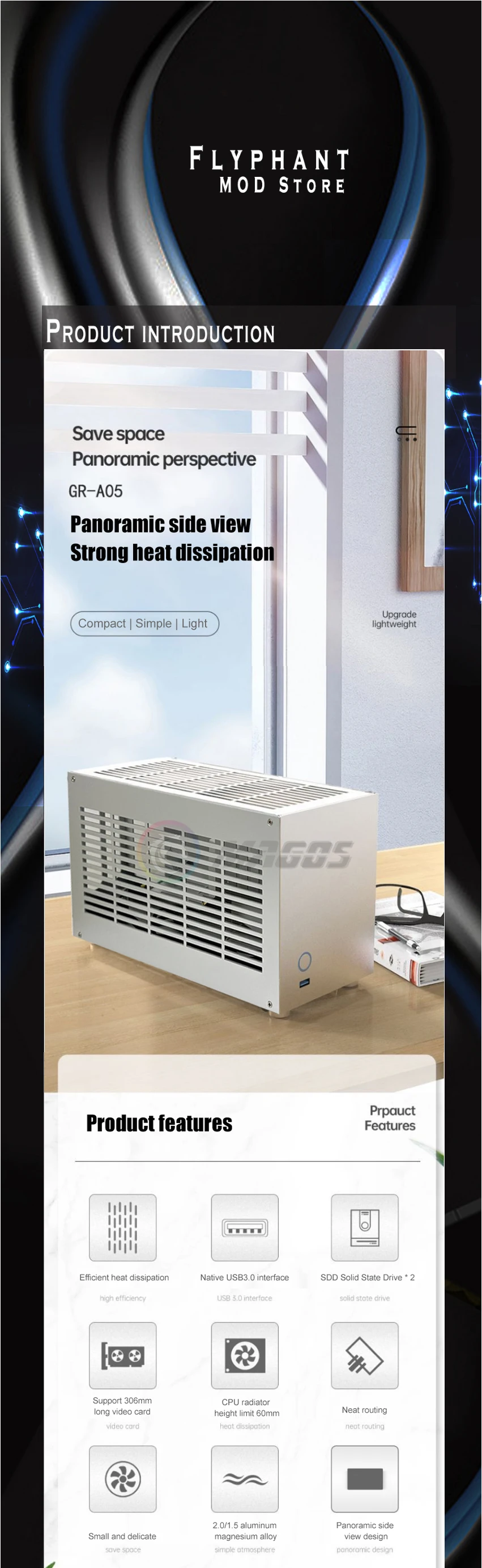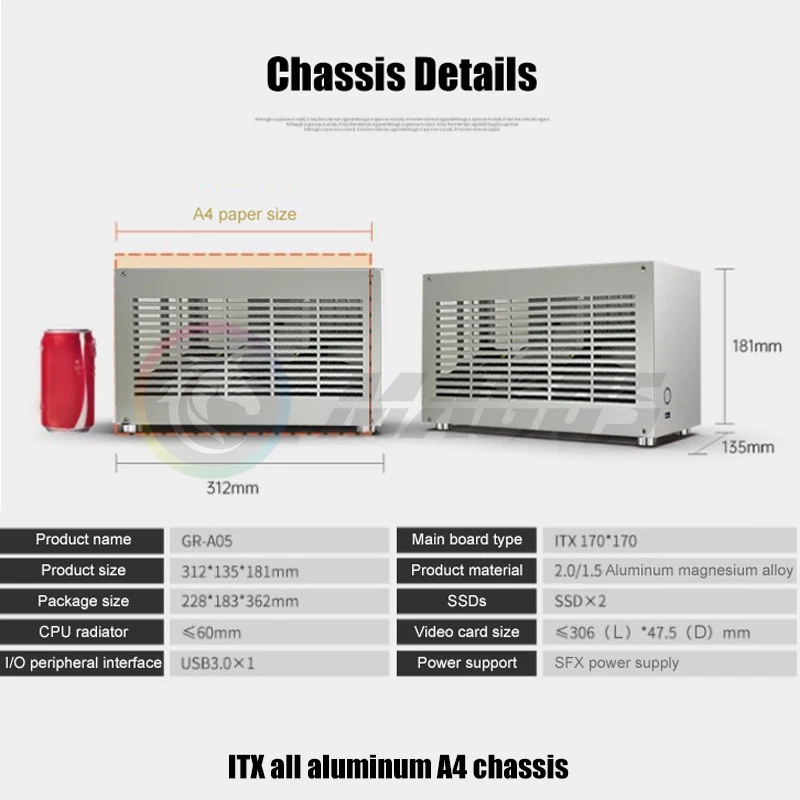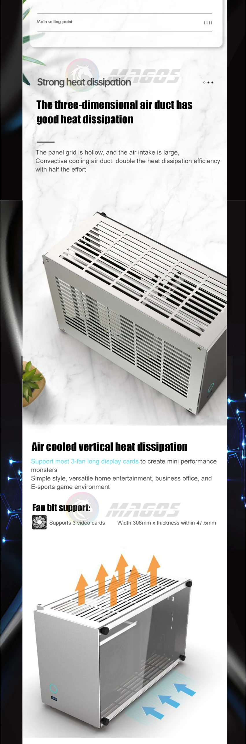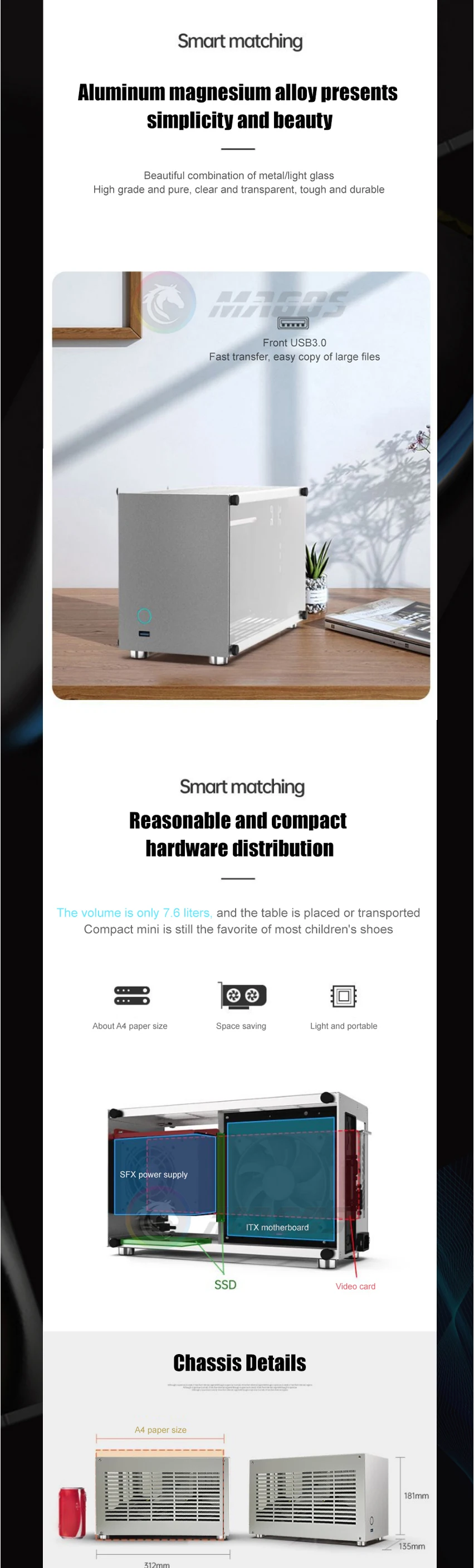 Carcasa de aluminio HTPC A4 Mini ITX compatible con enfriador de CPU de 70mm/GPU SSDX3/SFX/PSU de 210mm, gabinete de jugador de juegos de computadora de escritorio MOD