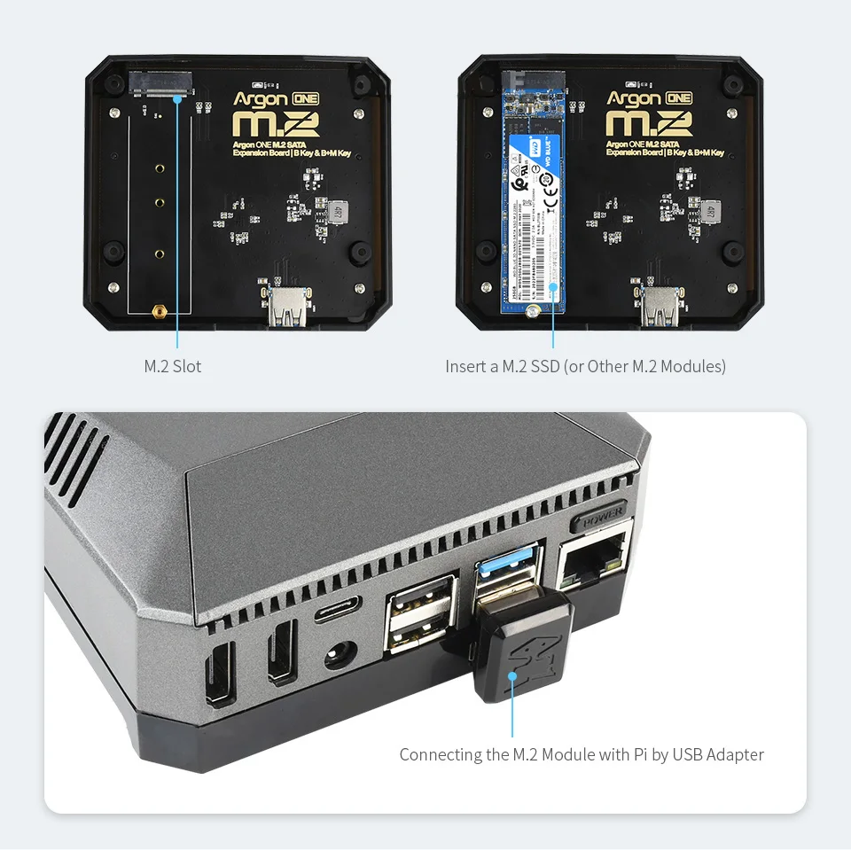 Admite módulos M.2 como SSD M.2, que luego se conecta al Pi mediante un adaptador USB