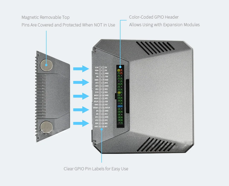 Parte superior magnética extraíble y cabezal GPIO bien diseñado