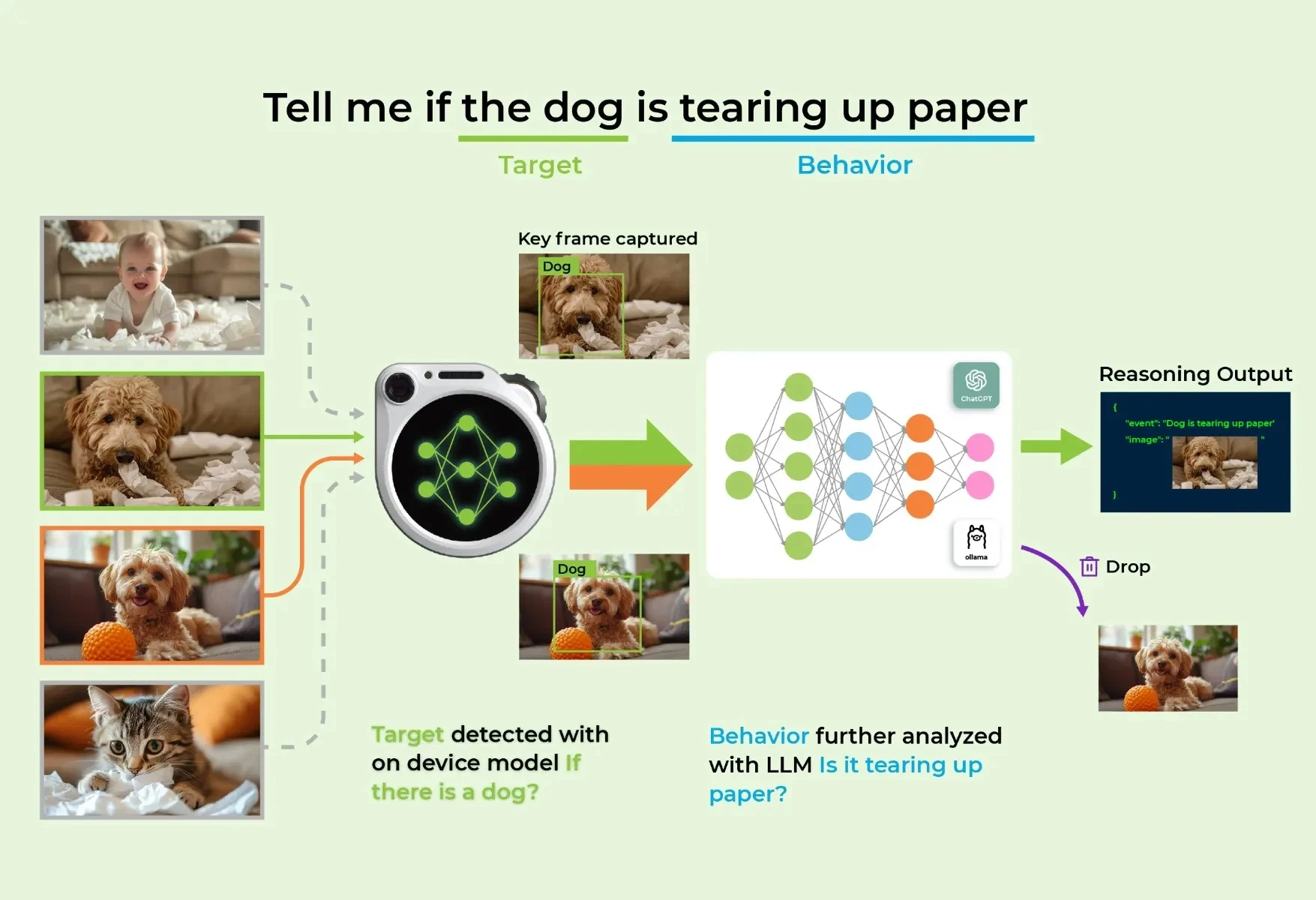 With the task "tell me if the dog is tearing up paper" when the on-device model detects dogs, this keyframe is sent to LLM for further analysis - is it tearing up paper? LLMs won't be triggered by people, cats, squirrel or others. This tremendously reduces LLMs' cost.