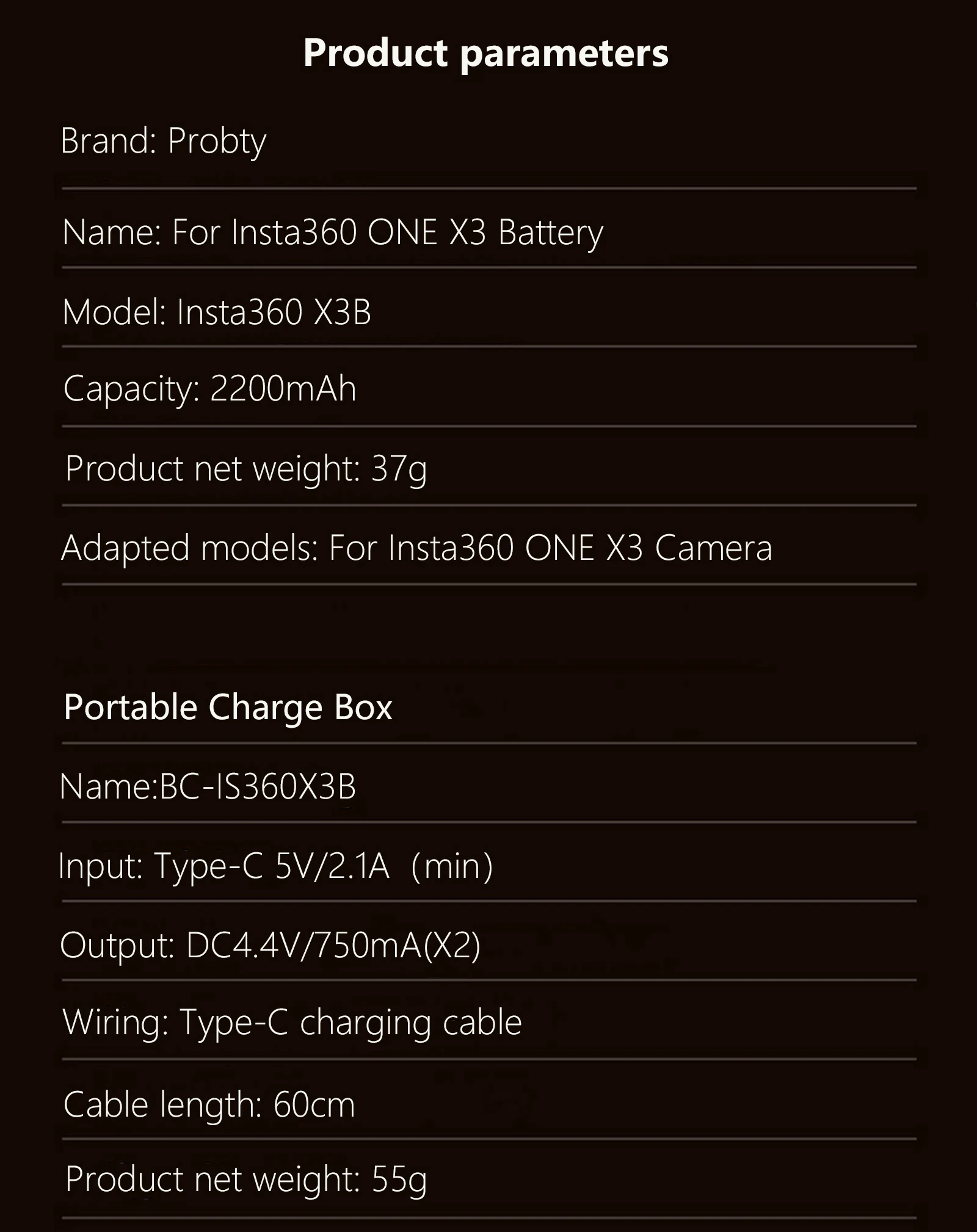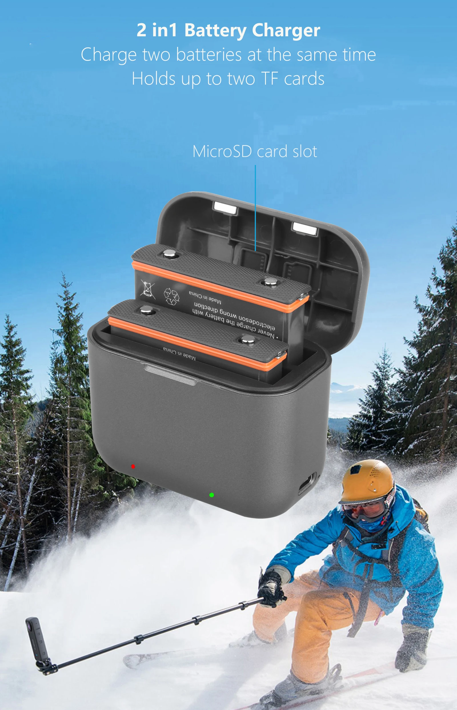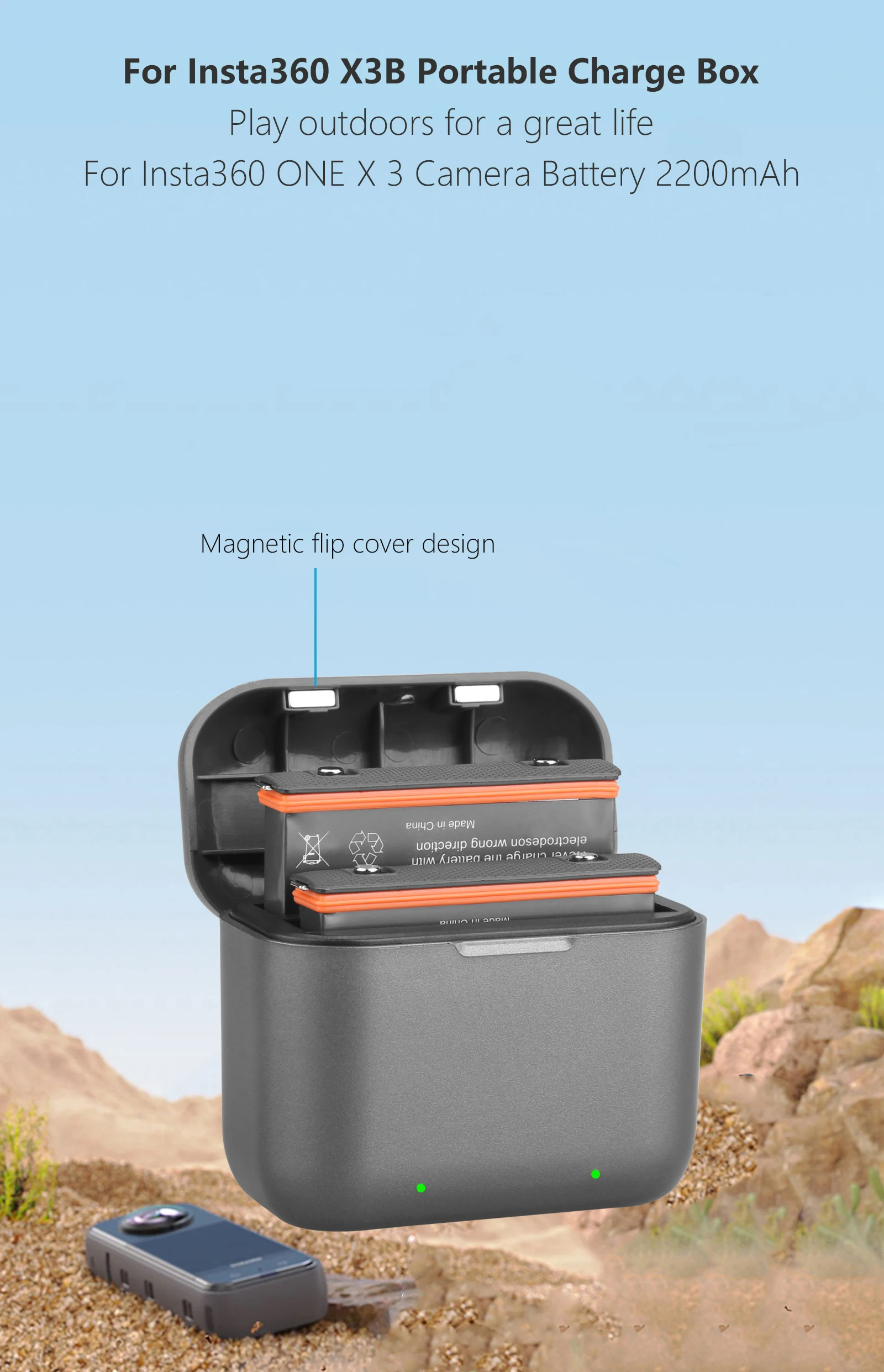 Para Insta360 ONE X3 Batería recargable + 2 ranuras para tarjetas Caja de carga de bateríaAccesorios de Cámara de Acción para cámara de acción Insta 360 ONE X 3Descripción de los productos:1. Para Insta360 One X3 caja de carga rápida portátil, de tamaño pequeño y potente rendimiento.2. La cubierta abatible de la caja de carga está diseñada con succión magnética, y la cubierta abatible y el cuerpo de la caja están fuertementeJuntado. No hay necesidad de preocuparse de que la batería se caiga cuando se abra la tapa abatible cuando se cargue.La caja se coloca en la bolsa3. La caja de carga puede cambiar inteligentemente el modo de carga de acuerdo con los diferentes estados de carga de la batería yCuide su batería X34. El diseño de la caja de almacenamiento no es solo un cargador de batería, sino también una caja de almacenamiento de batería y una caja de almacenamiento de tarjeta MicroSD.Modelos de cámaras de vídeo compatibles:
