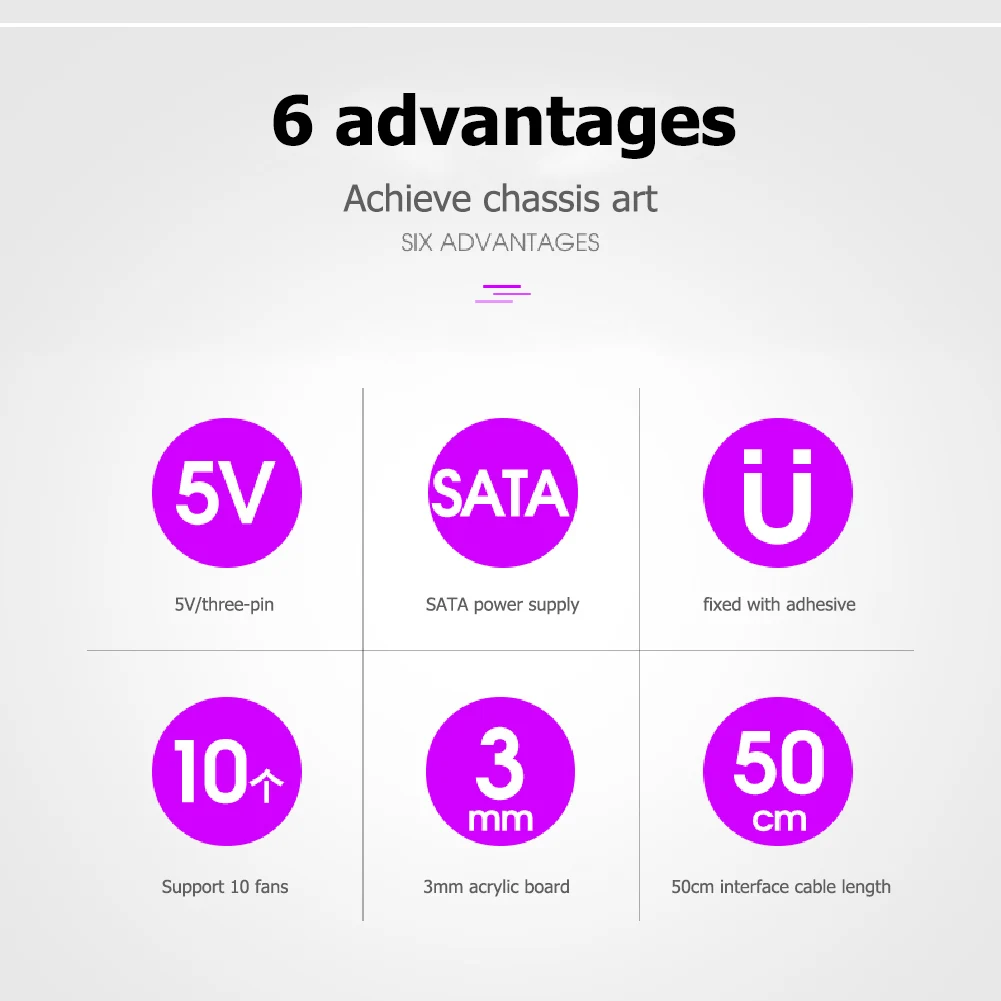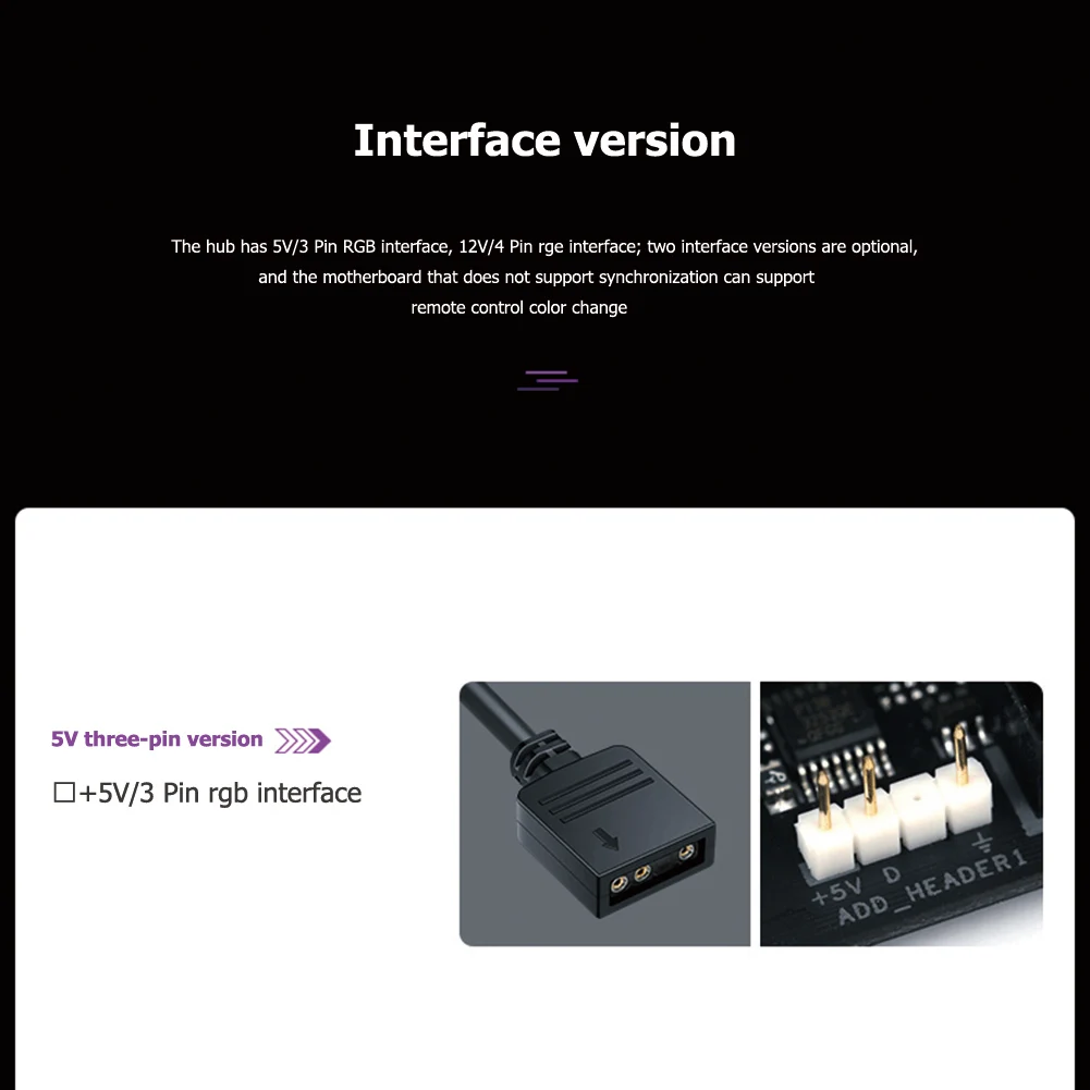 1. Compatible con ASUS, MSI, Gigabyte, placa base ASRock 5V/3 pines, interfaz de control de iluminación a través del control de la placa base, puede sincronizar la iluminación con otros productos de la D-RGB.
