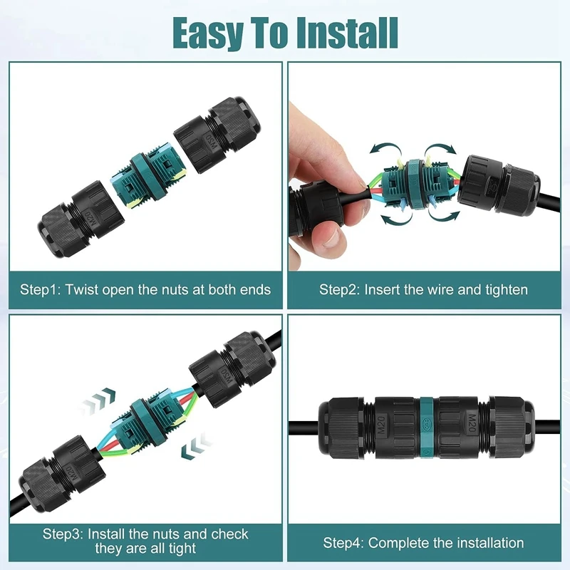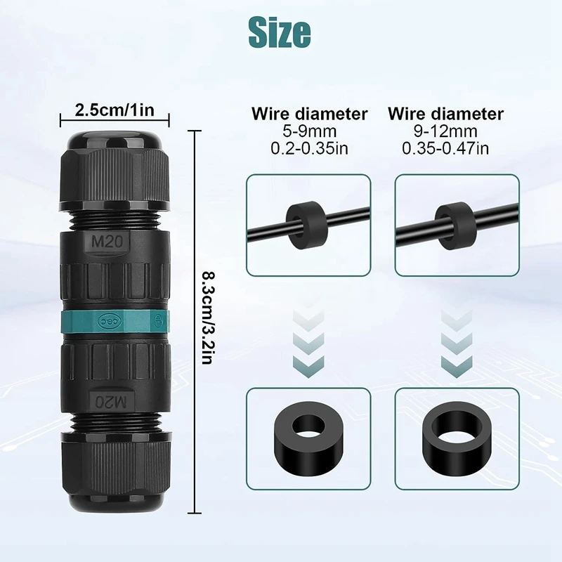 FÁCIL INSTALACIÓN: Conexión rápida, montaje sin tornillos, simplemente abra ambos extremos del conector del cable impermeable, Pase el cable directamente, cambie el diámetro interior del anillo de goma por el tamaño del cable, luego apriete para completar el sello impermeable.