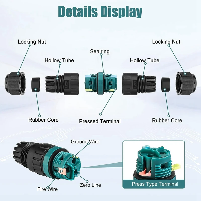 MATERIAL DURADERO: Nuestro conector de cable impermeable está hecho de carcasa de plástico PA66 de alta calidad y material de latón niquelado con alta resistencia, que es anticorrosión, resistente a altas temperaturas y bajas temperaturas, retardante de llama, prolonga la vida útil de los cables.