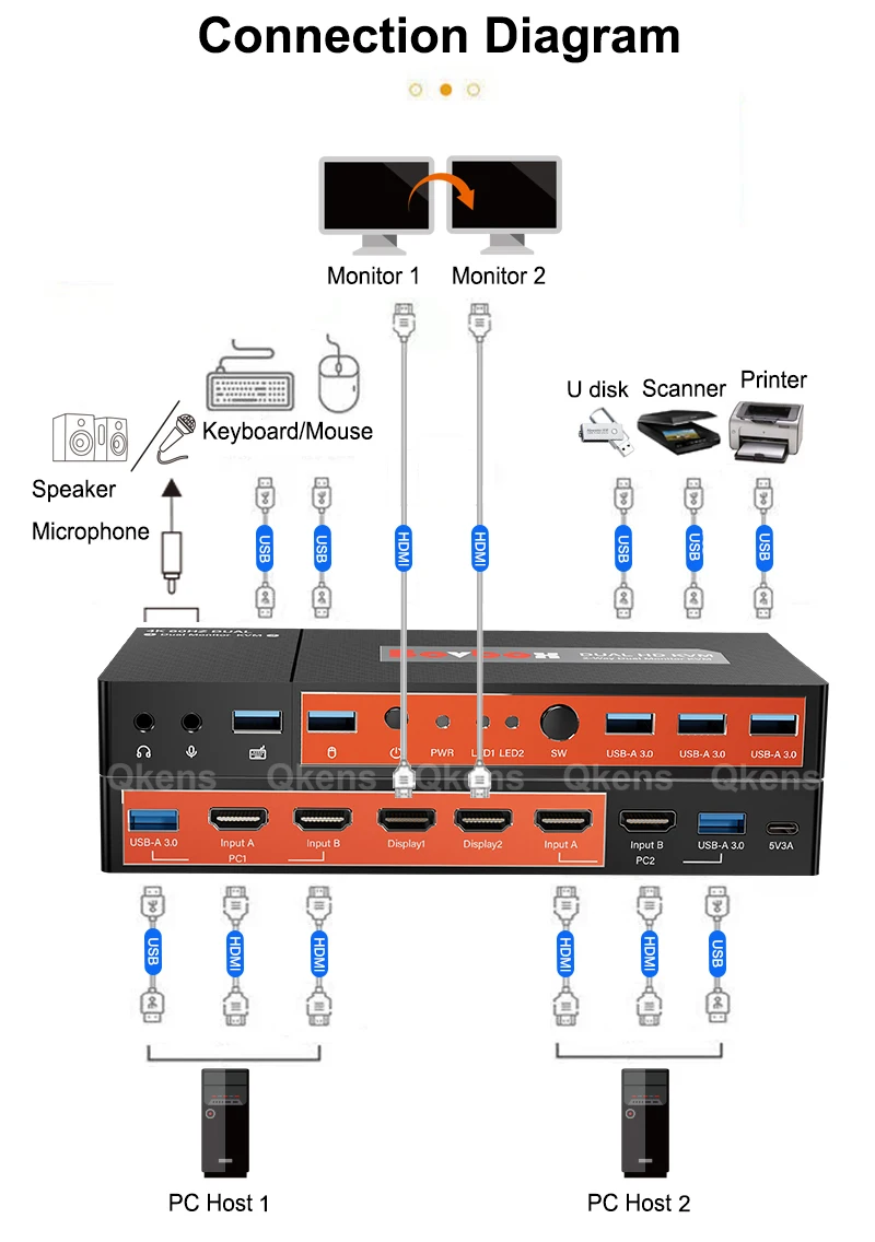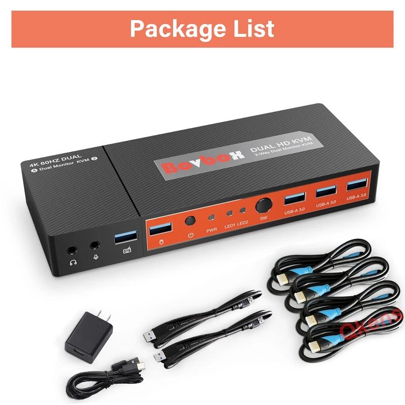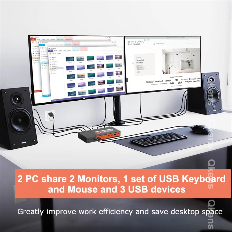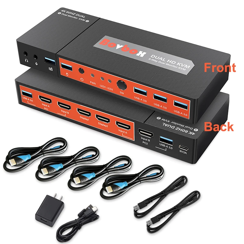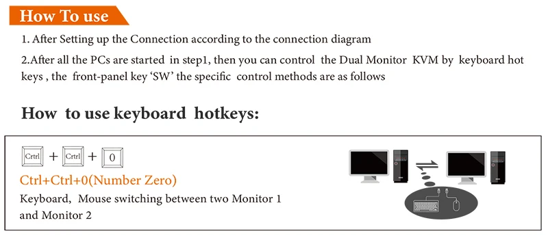 Usando solo 1 Juego de teclado, ratón y 2 monitores para controlar 2 ordenadoresCompatible con Unix/Windows/Debian/Ubuntu/Fedora/Mac OS X/Raspbian/Ubuntu para Raspberry Pi y otrosSistema básico LinuxResolución de soporte de hasta 3840*2160 @ 60HZAdmite conectar en caliente, desconectar o conectar dispositivos al KVM en cualquier momento sin apagar el PCCon emuladores EDID en cada puerto de entrada, mantenga siempre la información correcta, evite la configuración de pantallas.Cambiar mientras los puertos de entrada switchinoAdmite teclas de acceso rápido del teclado y botón del panel frontal para controlar KVMDisponible para usar el teclado y el ratón sin demoraCon Puerto USB 3,0 adicional, se puede usar para disco flash USB, escáner, impresora u otro dispositivo USB, transferencia más rápida
