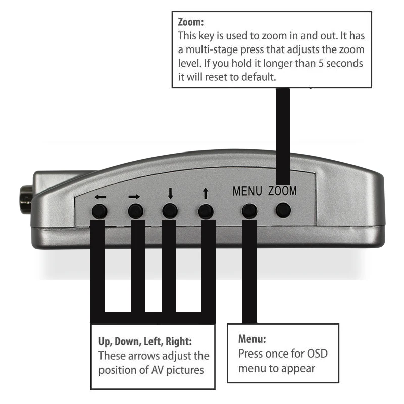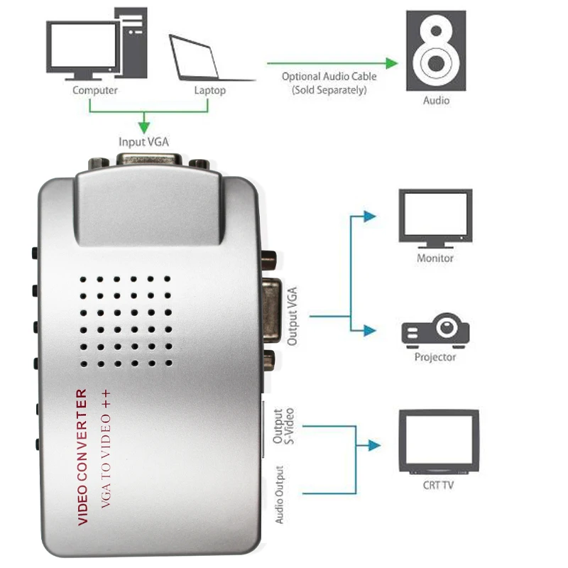 Este convertidor puede ayudarlo fácilmente a realizar la conversión de señales VGA en señales de video/S video. Para que las películas que descargó de Internet se puedan combinar completamente con el cine familiar, y pueda experimentar fácilmente el efecto del cine. Además, puede demostrar que BRM debe presentarse a la audiencia a través del televisor de pantalla grande.Características:1. Admite Salida de VIDEO compuesto, S-VIDEO, RGB (opcional).2. desde el puerto PS Alimentación/2 o USB. Soporte 640X480 @ 60/72/75/85Hz .800x600 @ 60/72/75/85Hz,1024x768 @ 60/70/75/85Hz , 1280x1024 @ 60 modo de visualización.3. Estado de operación de visualización en pantalla (OSD), zoom, tamaño.4. Tamaño horizontal independiente y ajuste de tamaño vertical, escalado 2D programable.5. Diseño de hardware puro, solo Plug & Display. No requiere controlador de software, compatible con cualquier sistema operativo.6. Sistema NTSC conmutable de vídeo, (para Japón), PAL, 1, 2, 2, combinación PAL-N y SECAM (a través de RGB OUT).7. La salida RGB (cable opcional necesario) es compatible con el formato.8. control de posición Admite, zoom y botón de menú.9. El botón MENÚ admite HSIZE, VSIZE, BRILLO, CONTRASTE, Tono, Saturación, Nitidez y ajuste de color de fondo OSD.10. Visualización simultánea en monitor VGA y TV.11,24 bits, digitalizador de color verdadero.Especificaciones:Una entrada de señales VGA, una salida de señales VGA.Una salida de vídeo, una salida de vídeo S.Un ACPI de 5V.Resolución de señales VGA: 640x480, 800x600, 1024x768, 1280x1024 (hasta 85Hz),1920x1080, 1600x1200, 2560x1600 (cubre la resolución VGA menor que WQXGA).Dimensiones (largo x ancho x Alto): aprox. 110x56x36mm.Peso del paquete: aprox. 355G.100% nuevo.Nota:Puede haber una diferencia de 1-3mm debido a la medición manual.