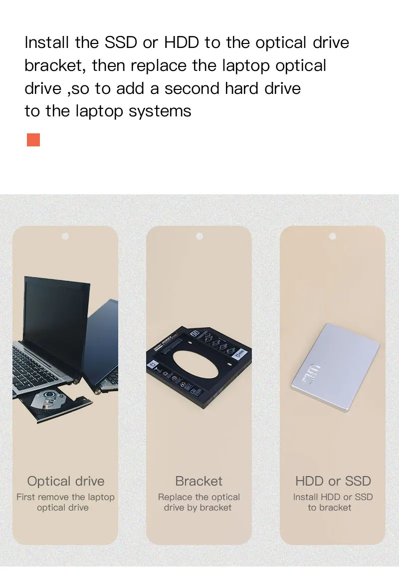 1. 100% artículo nuevo y nunca usado; 2. El grosor de este adaptador es de 9,5mm; 3. Interfaz interna: SATA (para 2,5 "HDD/SSD o unidad SSD); Interfaz externa: SATA (para ordenador portátil/placa madre); 4. Soporta SATA I & SATA II & SATA III; 5. El Caddy segundo/Adaptador de disco duro para ofrecerte la máxima flexibilidad de almacenamiento de datos. Con el segundo HDD en tu portátil, 6. Puede acelerar la realización de copias de seguridad de aplicaciones importantes y datos críticos (simplemente retire su unidad de disco duro y coloque el Caddy (con el disco duro adicional) en su lugar.