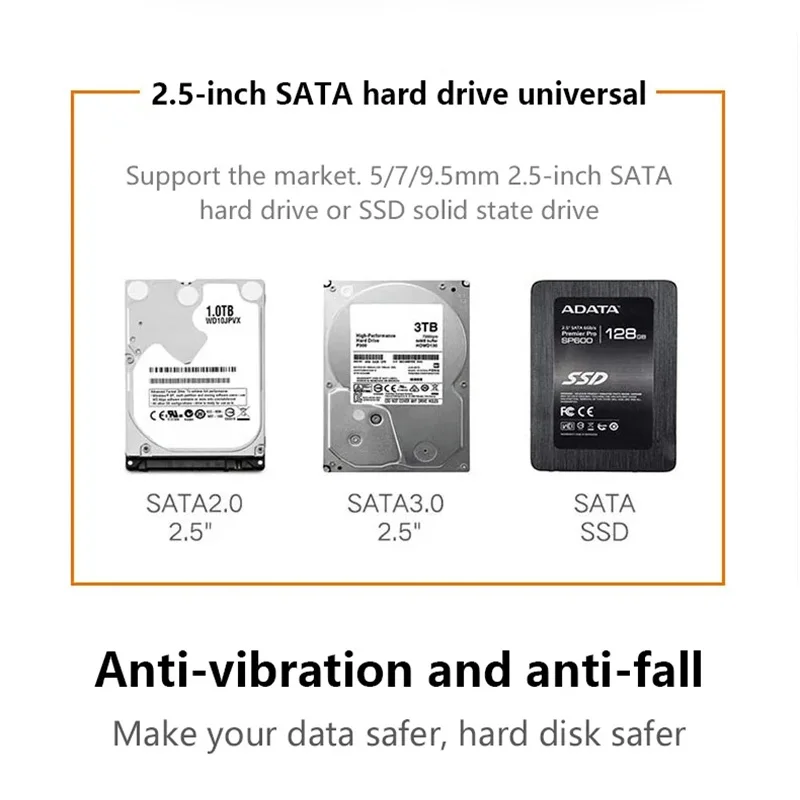 4.Compatibilidad universal: admite sistemas Windows, LINUX, Mac OS 8.0 y superiores.Diseñado para HDD y SSD SATA de 2,5 pulgadas, 7 mm/9,5 mm de hasta 6 TB.Compatible con WD, Seagate, Toshiba, Hitachi, Samsung, Crucial, SSD y HDD con puerto SATA, etc.