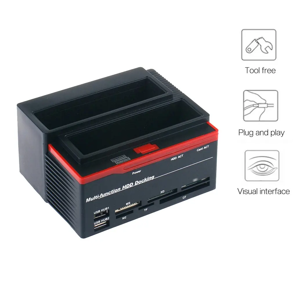 Es un soporte de disco duro multifuncional con lector de tarjetas/HUB incorporado en ranura SATA + IDE. Diseño de forma a la moda, la apariencia es principalmente negra, con dispositivo de iluminación intermitente roja, los dos diseños a juego de colores son únicos en su belleza, hermosos/modernos.